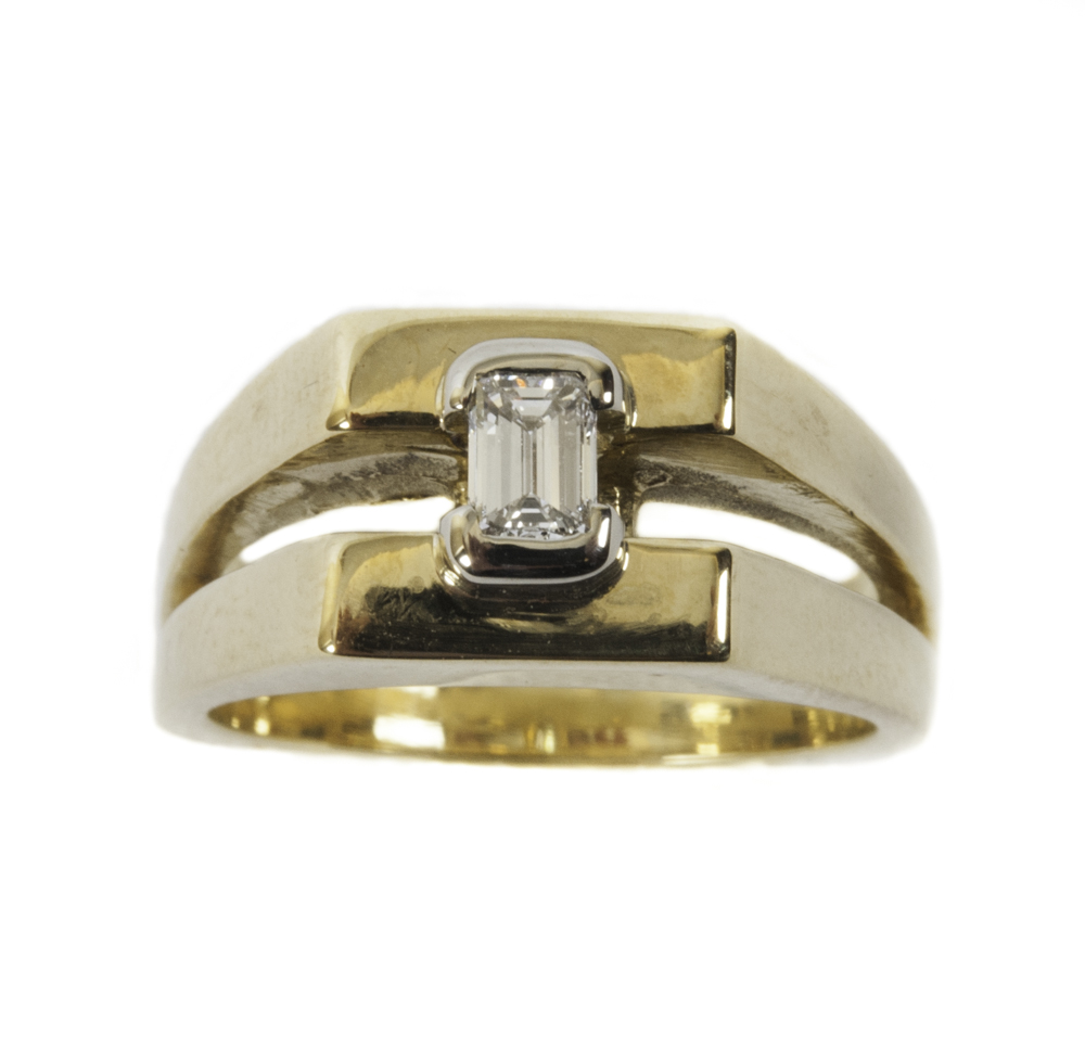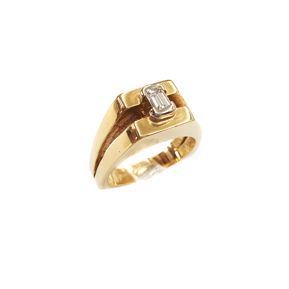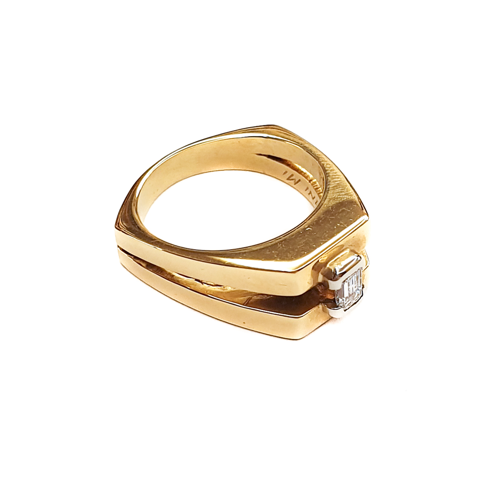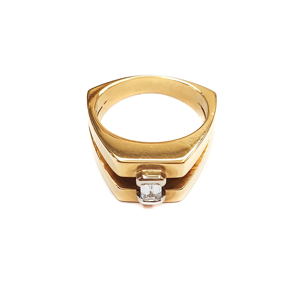 Stylish 18k yellow gold ring made in Italy during the Seventies. The double shank is characterized by a large slot in the middle, and the two parts holds in the centre a diamond. The quality and clarity of the step cut gem are excellent, and its weight is 0.22 carats.
