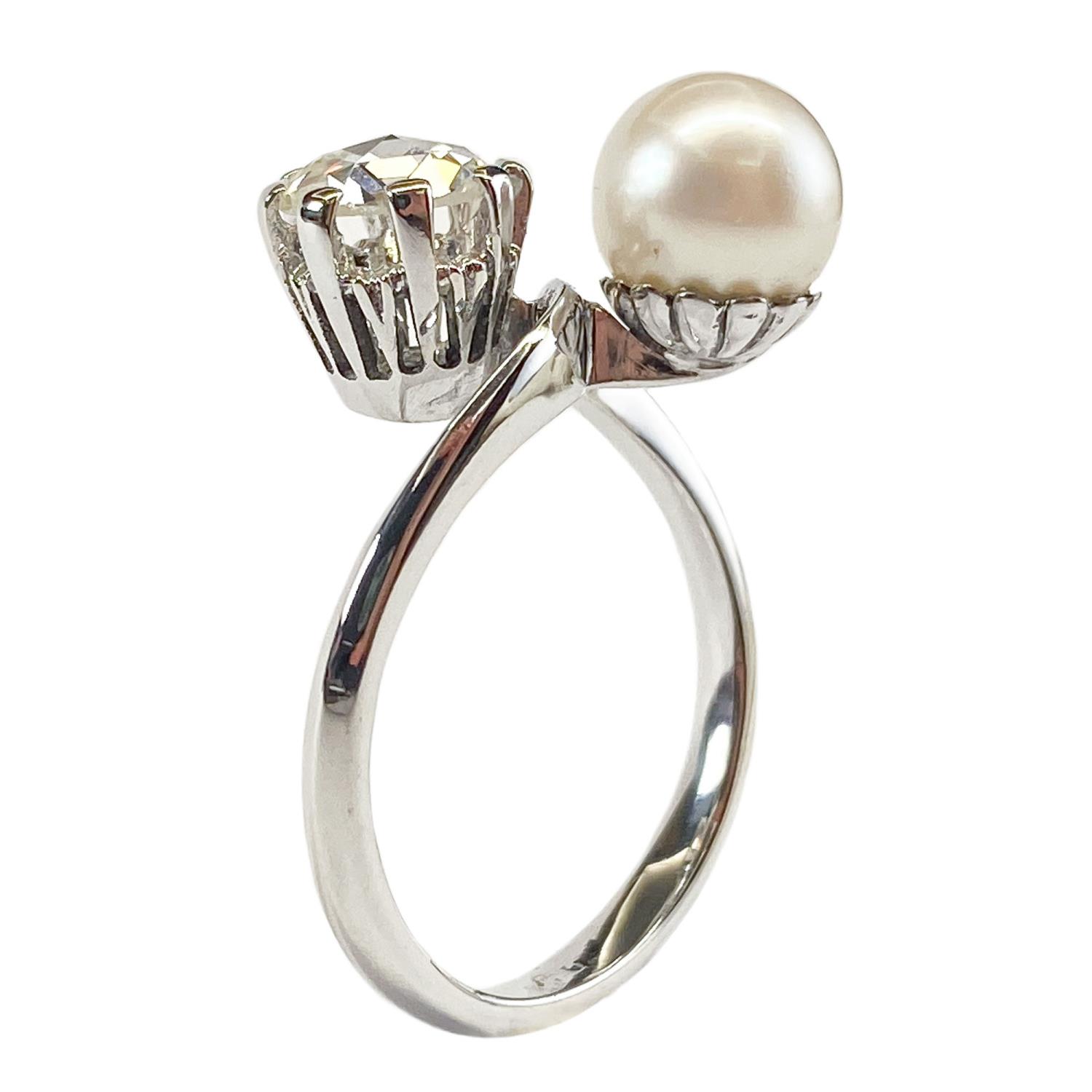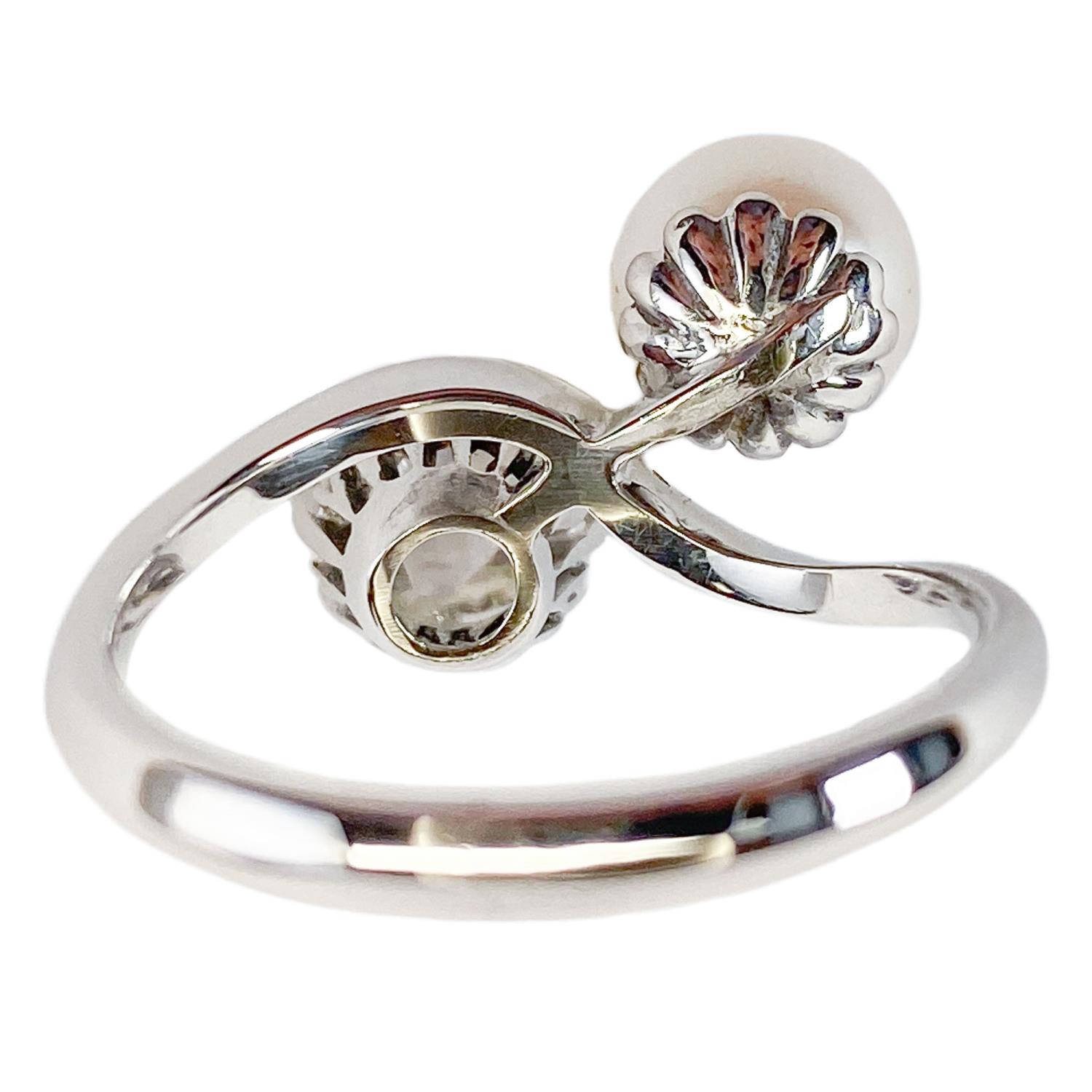 Delizioso anello a contrarié realizzato in oro bianco 18 karati con una perla Akoya di 7,50 mm di diametro accostata ad un diamante rotondo di taglio a rosa olandese di 0,40 carati circa, trattenuto da un castone a cestino con otto punte. Il gambo ha una bella forma mossa che va ad abbracciare le gemme in modo molto delicato. Gioiello fine, dalle linee classiche, in buono stato di conservazione.
