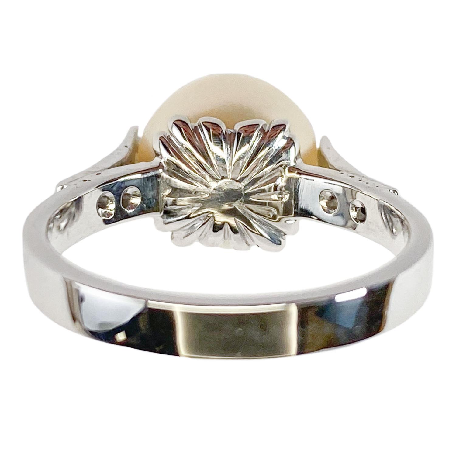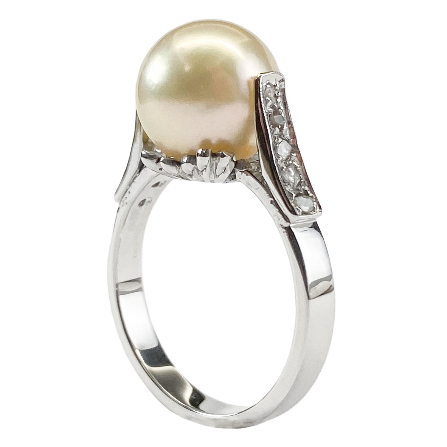 Raffinato anello in oro bianco 18 karati con una perla Akoya da 10,00 mm di diametro appoggiata su una coppetta a conchiglia e racchiusa tra due riporti decorati da diamanti di taglio a rosa che dal gambo si allungano fino ad arrivare a metà della gemma. La perla, dalla forma perfettamente sferica, presenta una superficie regolare ed omogenea ed ha il tipico colore bianco con sfumatura crema. Gioiello dall'eleganza discreta, in ottimo stato di conservazione.