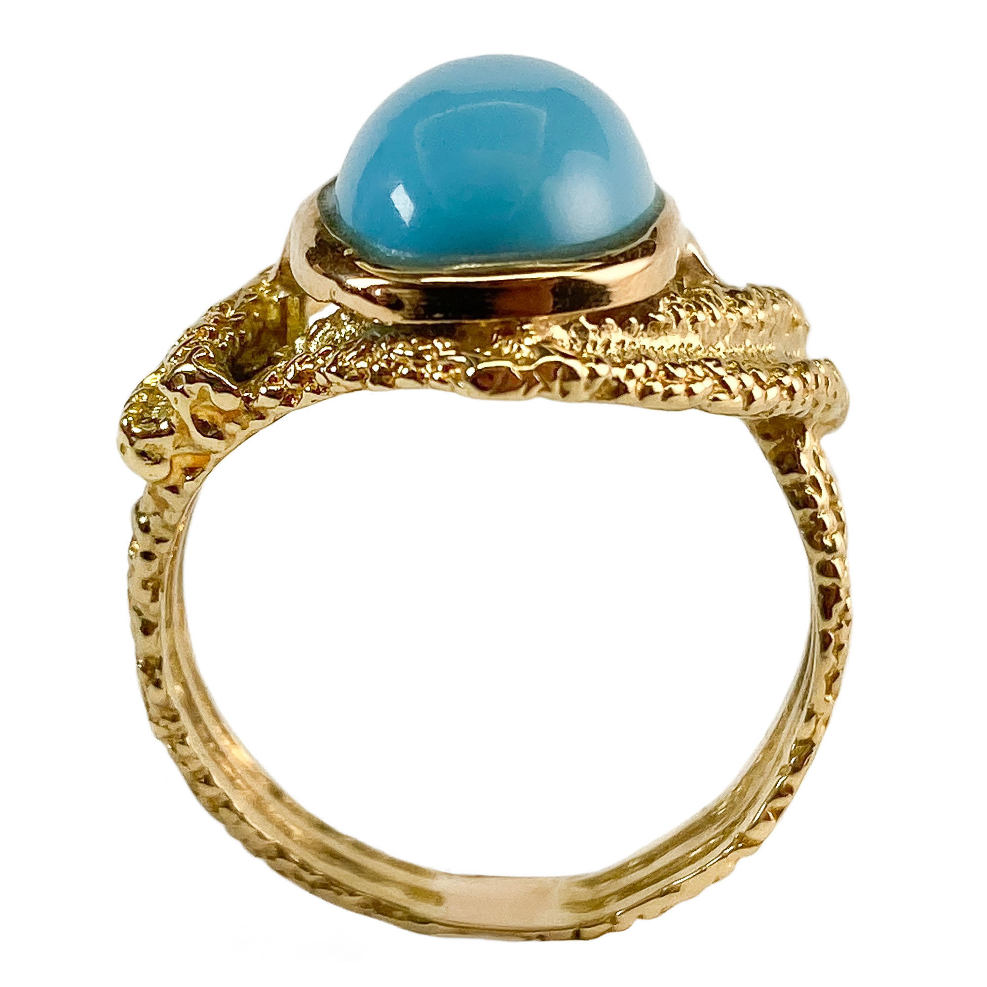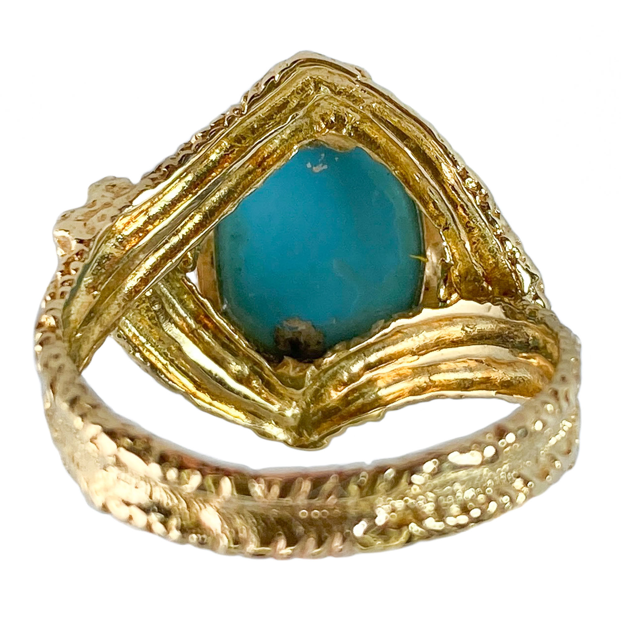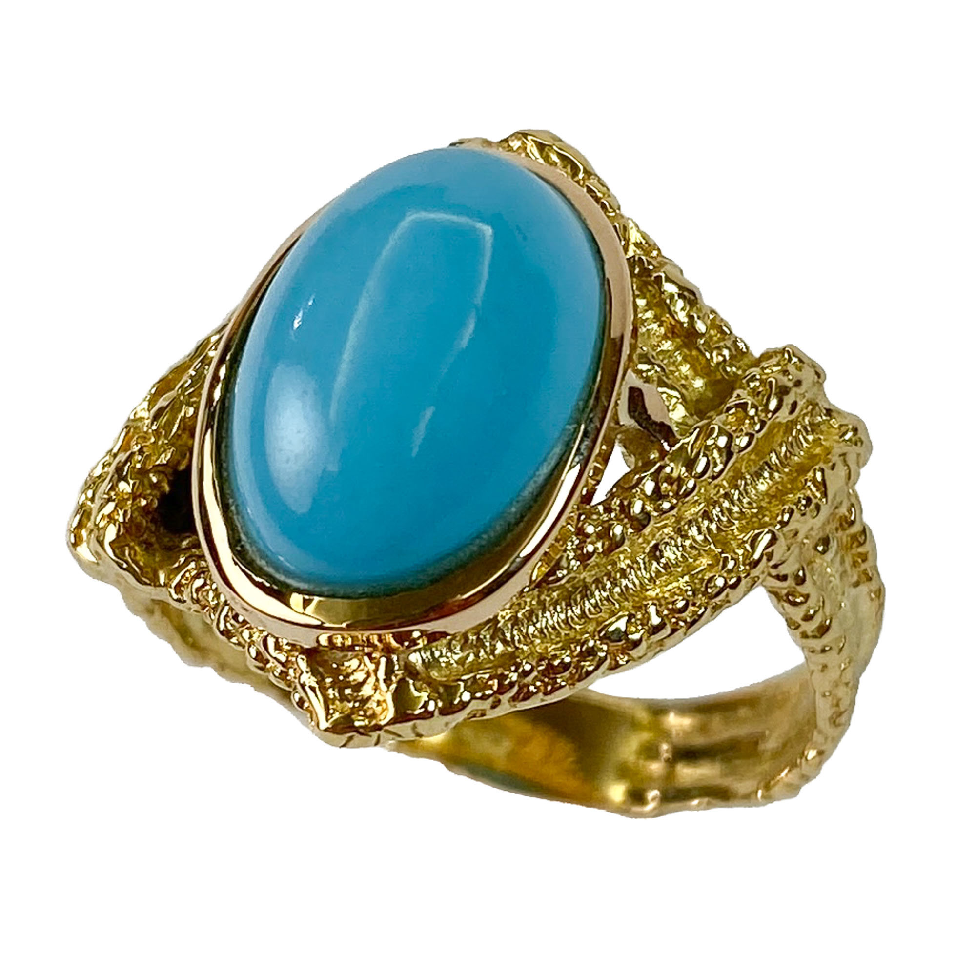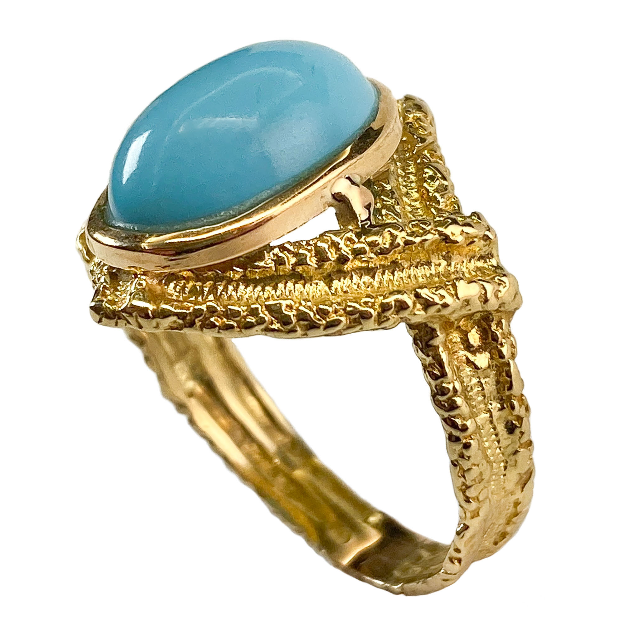 Originale anello realizzato in oro giallo 18 karati lavorato a corteccia, al centro è incastonato un turchese cabochon ovale di un bel colore intenso. Il design originale e il bel gioco cromatico rendono questo gioiello davvero unico. La pietra turchese, con il suo inconfondibile colore azzurro, è stata molto utilizzata in gioielleria fin dall'antichità ed è ancora oggi molto amata.