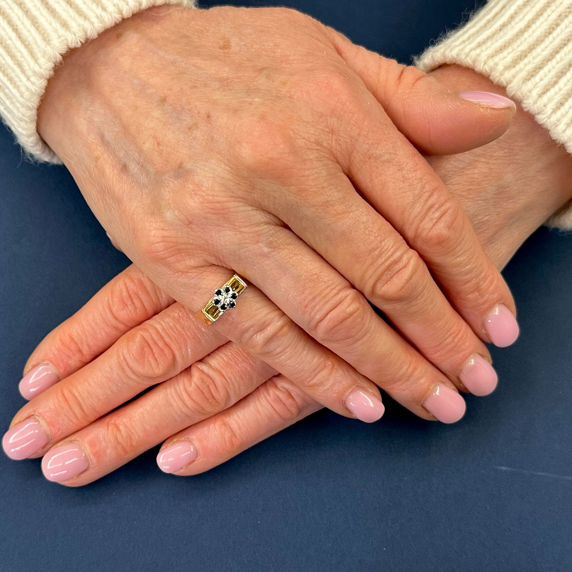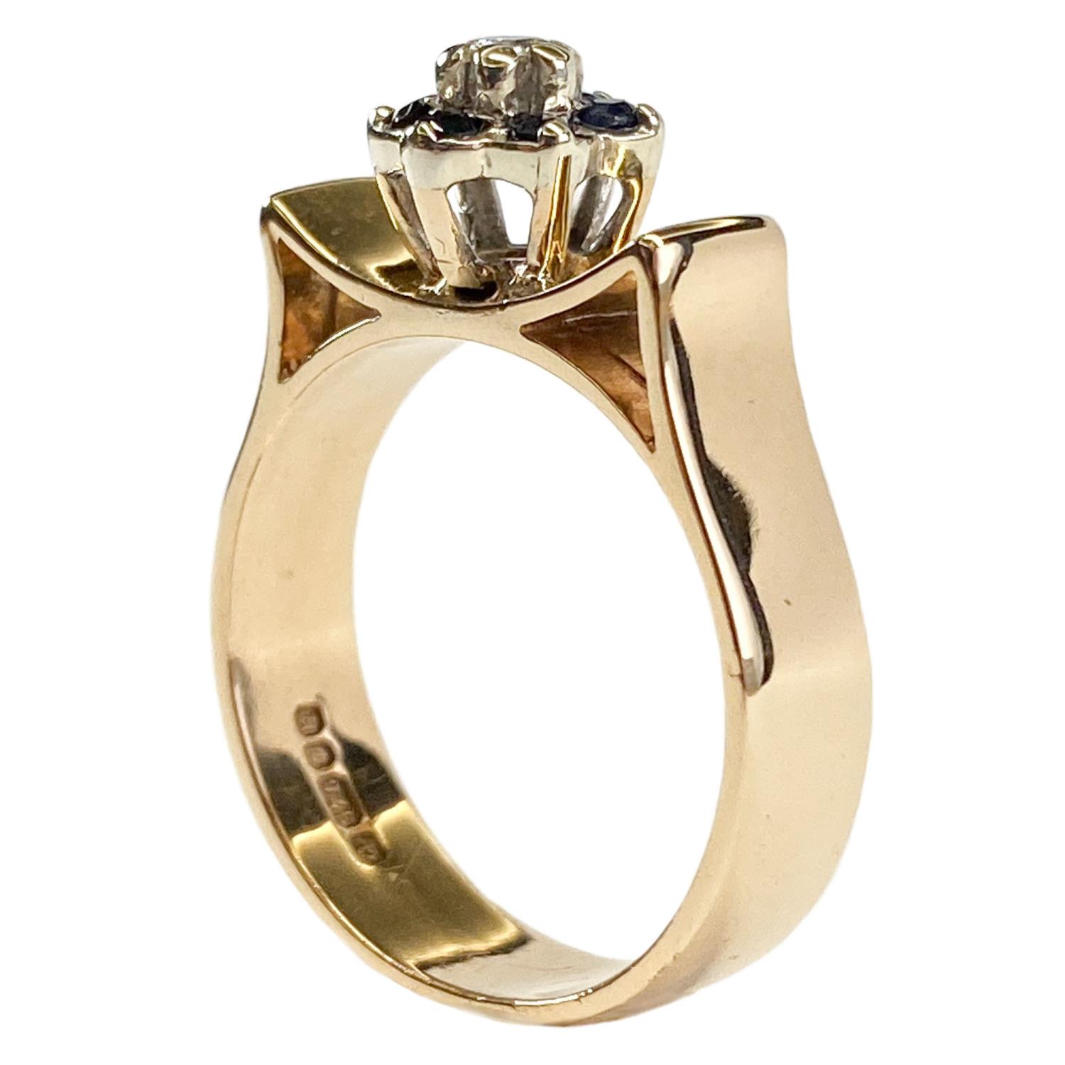 Anello a larga fascia realizzato in Inghilterra in oro giallo 9 karati. Al centro della testa, dalla particolare forma concava, è presente una margherita i cui petali sono formati da sei piccoli zaffiri rotondi e i pistilli da un diamante di taglio a brillante rotondo. Gioiello dal design originale, in ottimo stato di conservazione.