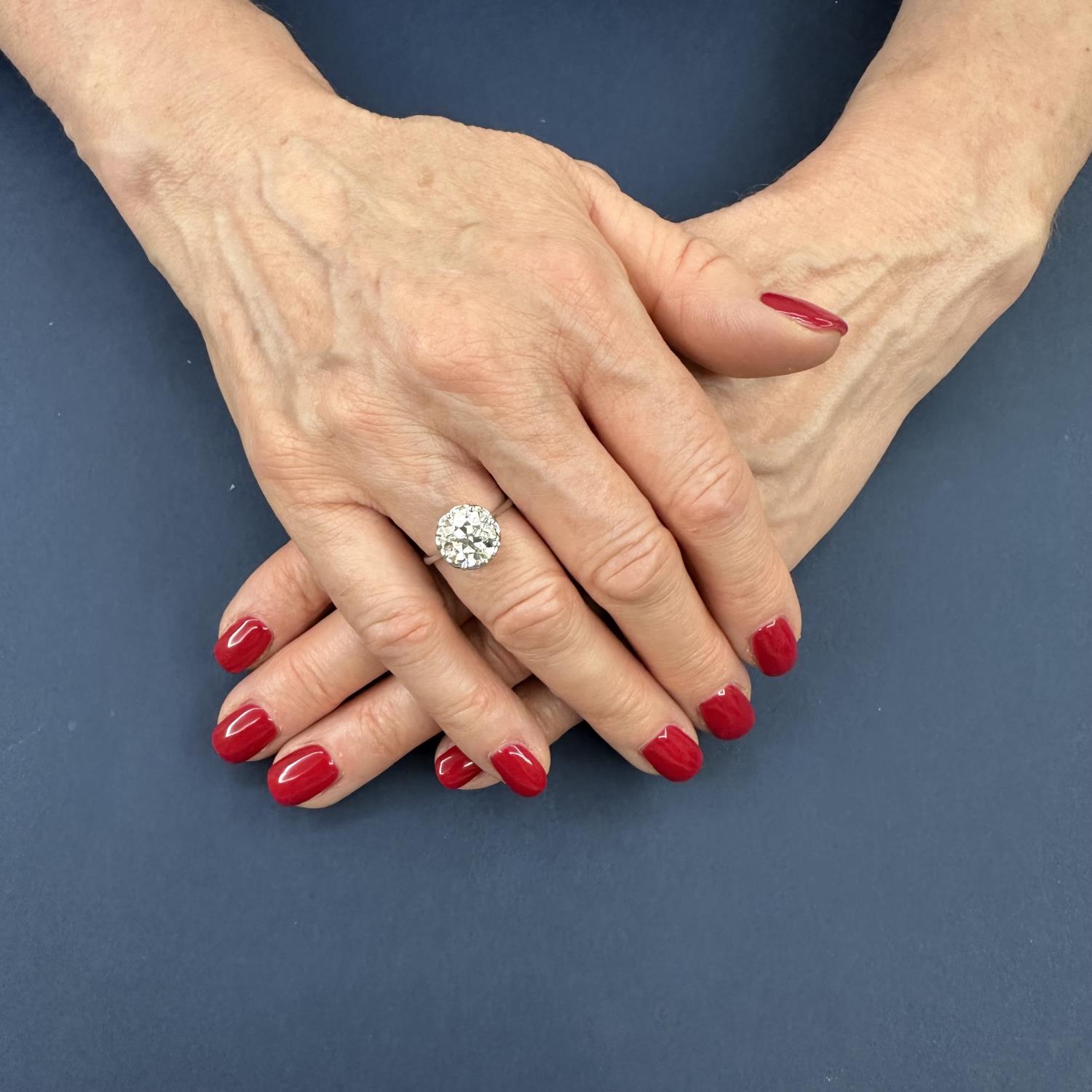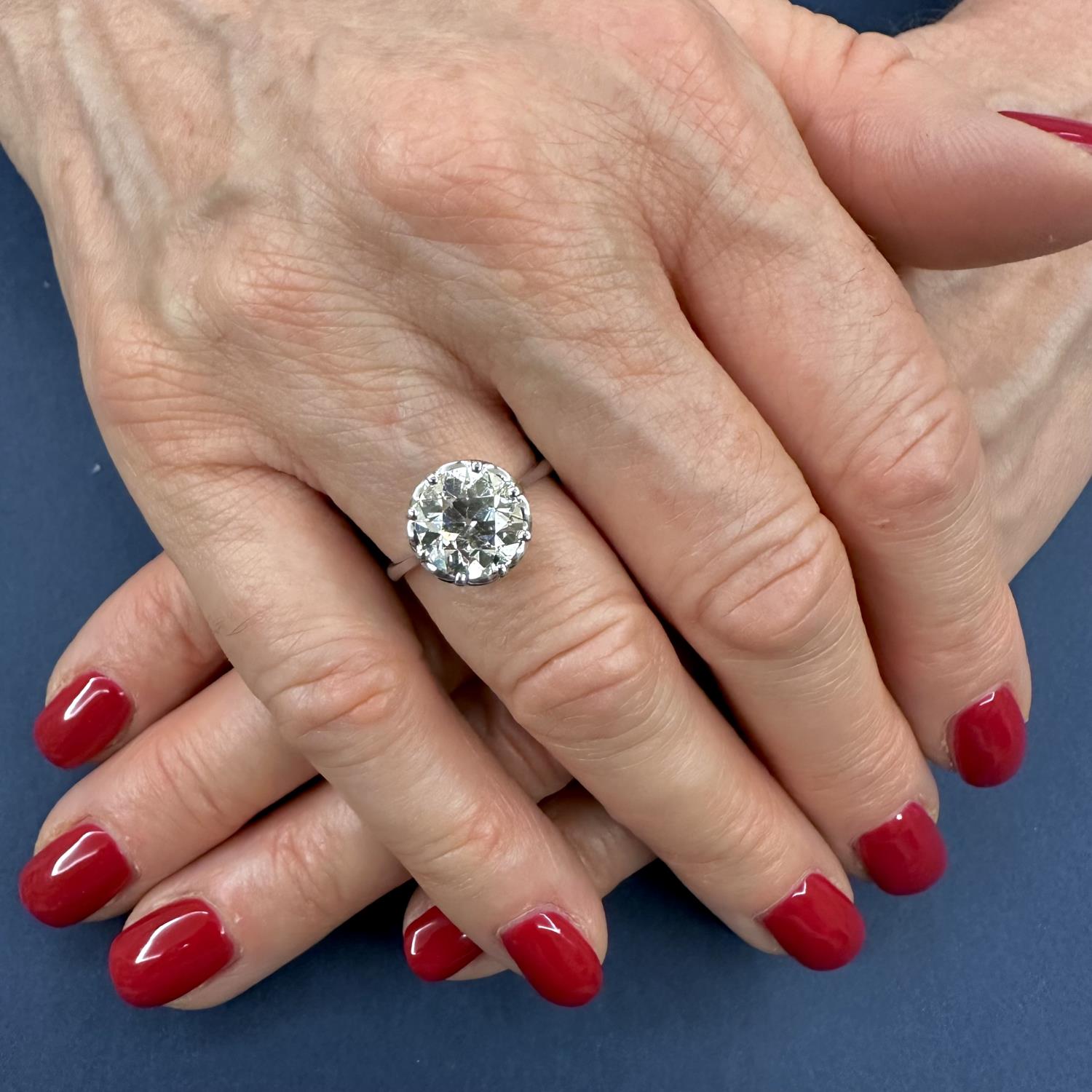 Meraviglioso anello solitario realizzato in oro bianco 18 karati con un diamante di taglio antico stimato di 3,80 carati, quasi incolore e con piccole inclusioni interne non visibili ad occhio nudo. Un raffinato cestino a otto punte lavorato artigianalmente trattiene la gemma esaltandone ulteriormente le dimensioni. Gioiello davvero unico, molto elegante e in perfetto stato di conservazione.