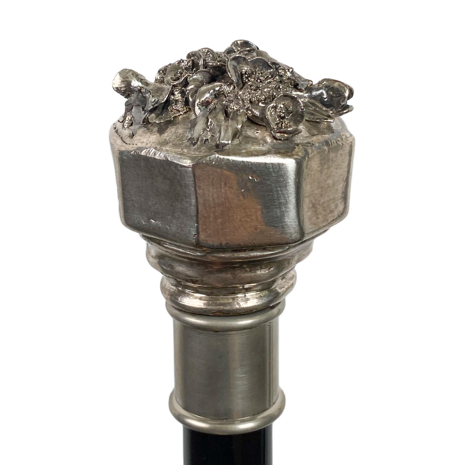 Originale bastone da passeggio con il fusto in legno nero lucido e il puntale in metallo dorato. L'impugnatura è in lega d'argento a forma di ottagono con la sommità ricoperta da un bouquet di fiori. Delizioso oggetto da collezione ma anche da uso quotidiano per i più appassionati, in ottimo stato di conservazione.