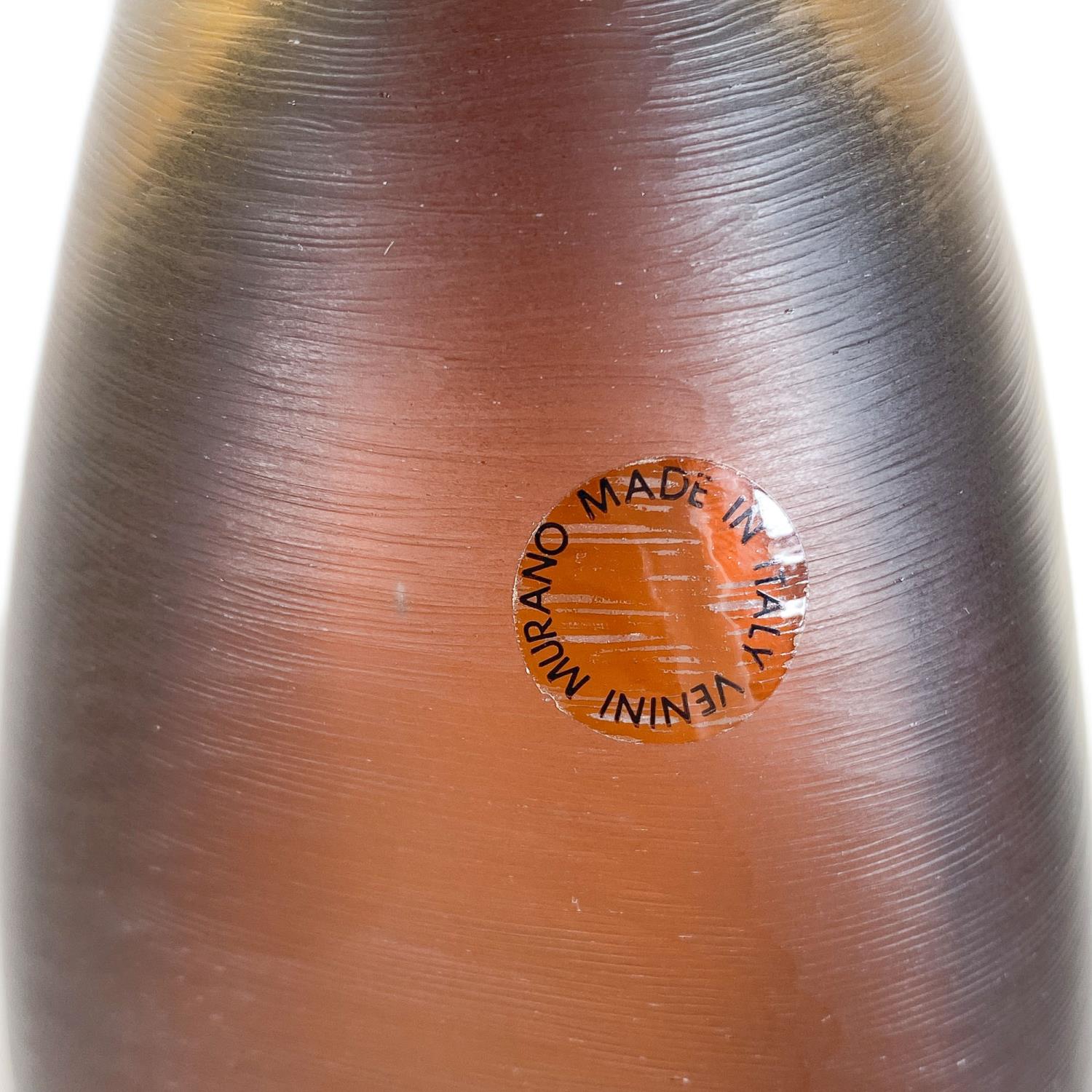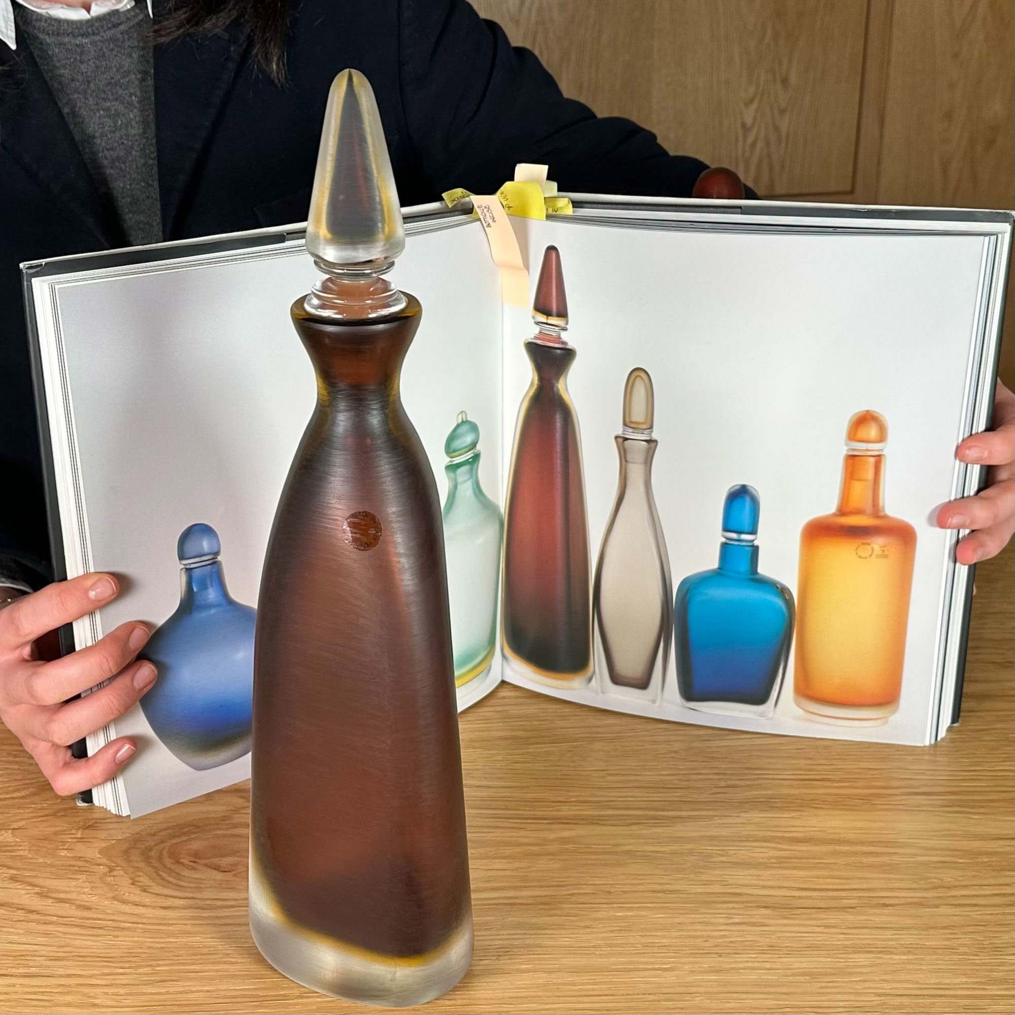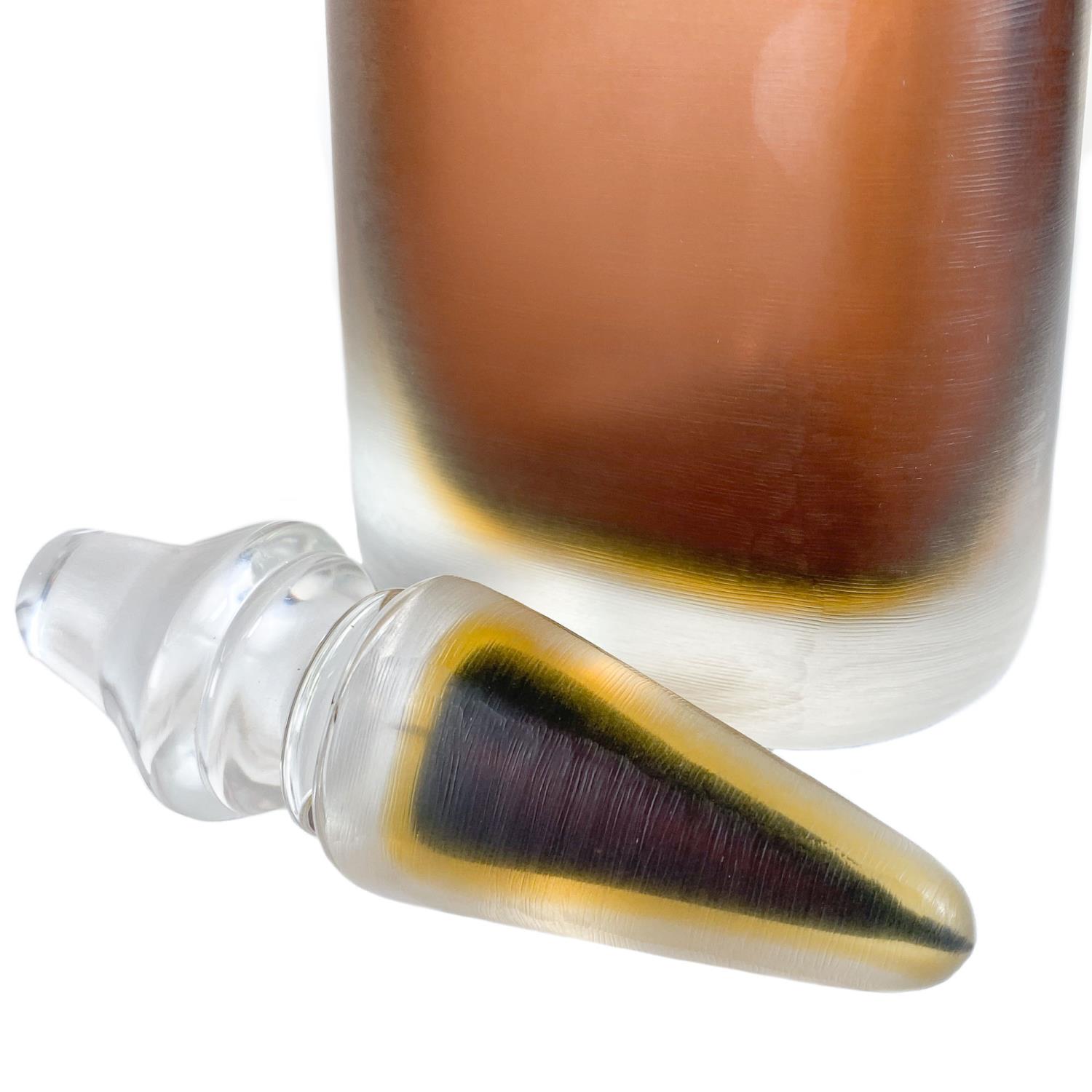 Bellissima bottiglia con tappo realizzata in vetro composto color prugna con sfumature giallo paglierino. Appartiene alla serie Bottiglie incise disegnata da Paolo Venini negli anni '50, infatti la sua superficie è tutta incisa da venature molto sottili, ottenute con una complessa tecnica di incisione a freddo. Il corpo a sezione triangolare ha una forma slanciata che si completa nel tappo conico, anch'esso tutto inciso. Presenta etichetta Venini originale e sul fondo reca la firma "Venini 92". Straordinario pezzo da collezione, raffinato e prezioso, in perfetto stato di conservazione.