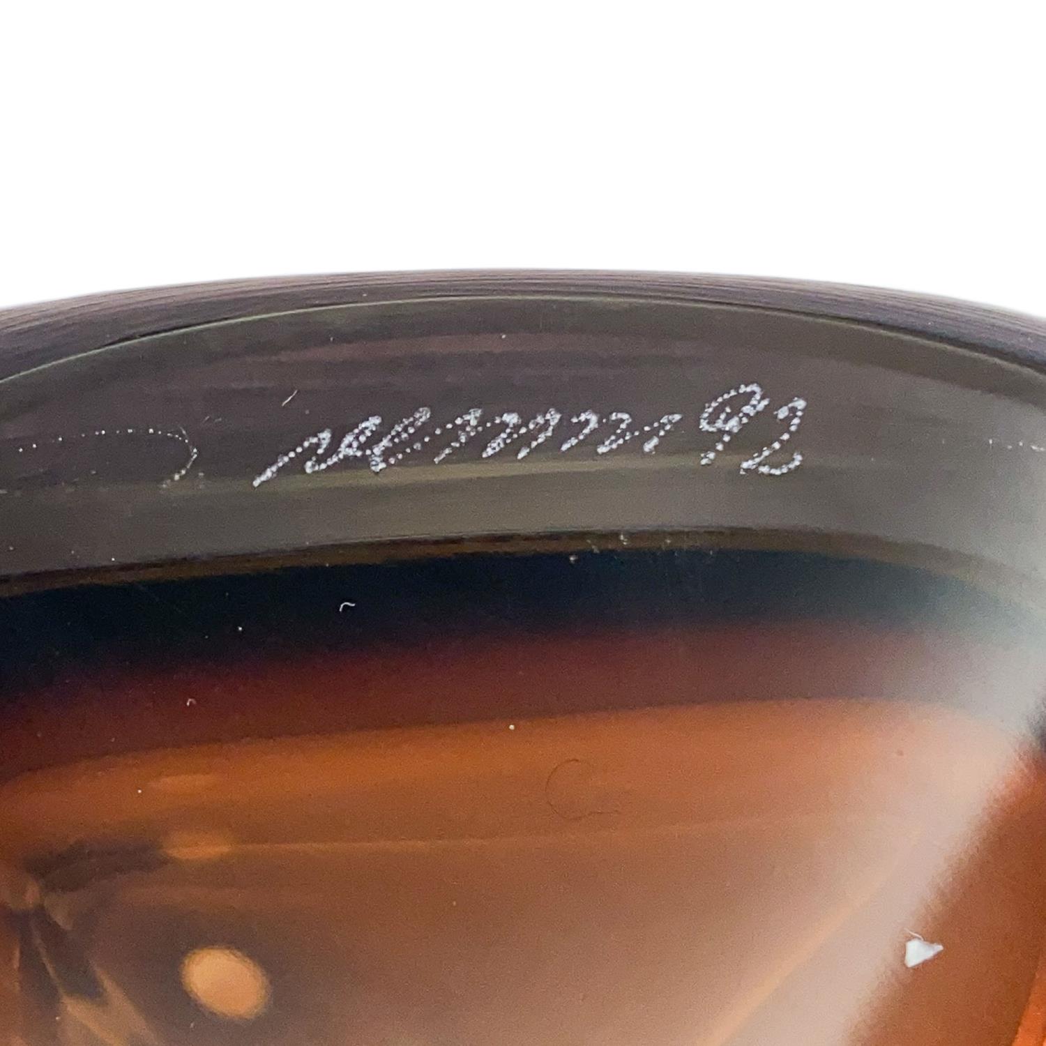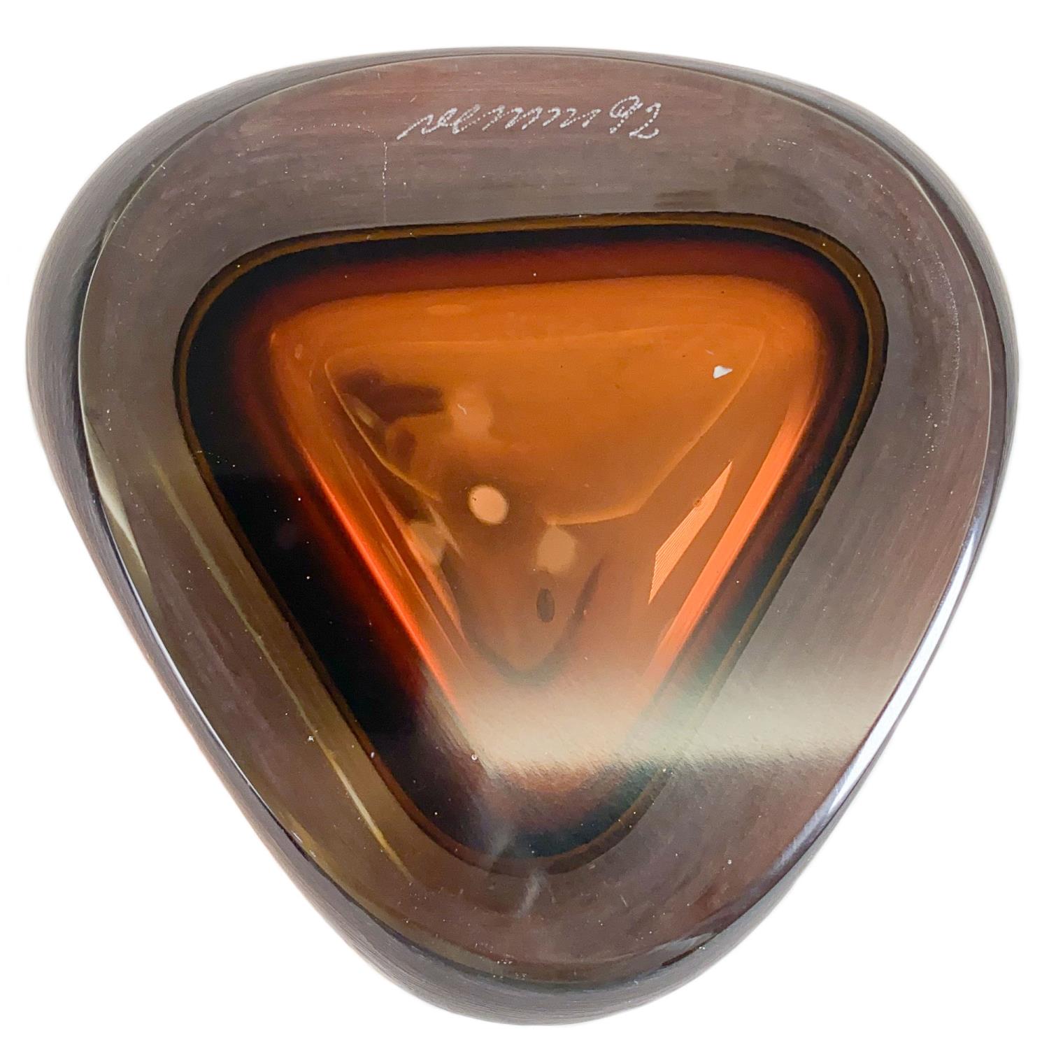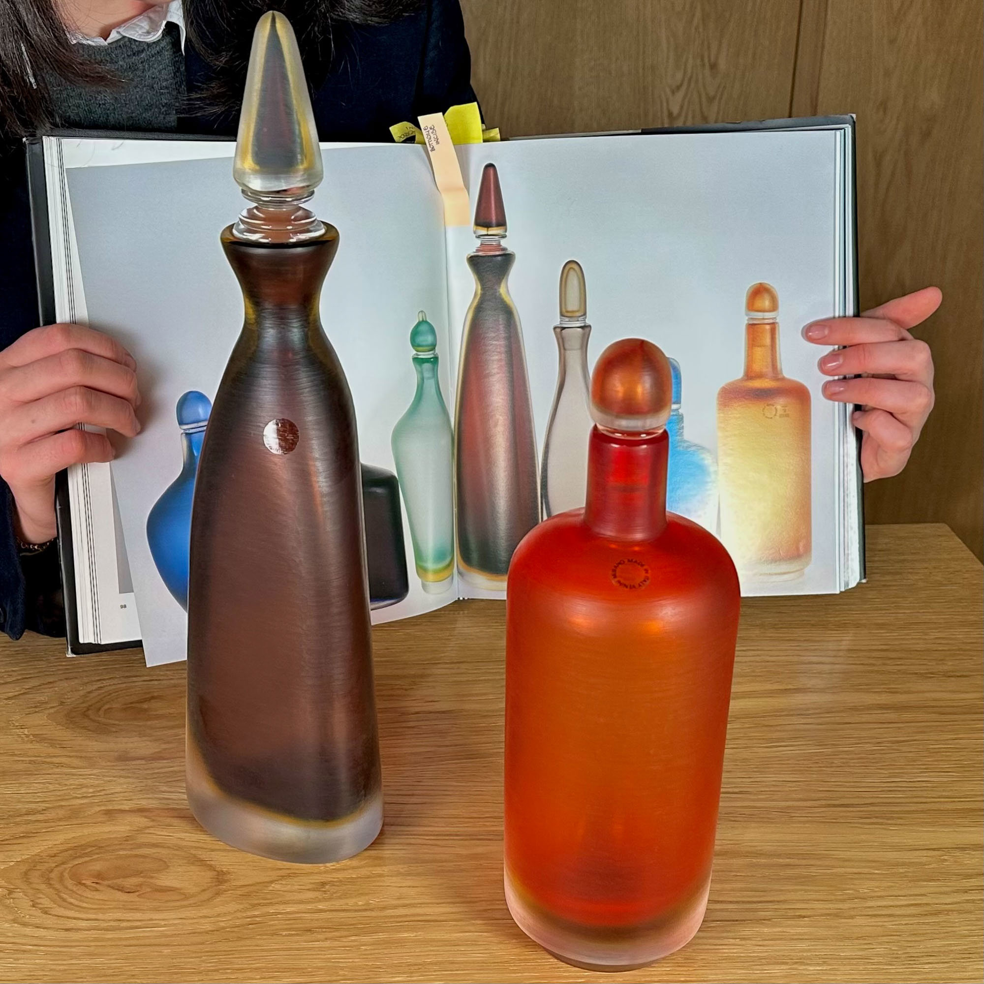 Bellissima bottiglia con tappo realizzata in vetro composto color prugna con sfumature giallo paglierino. Appartiene alla serie Bottiglie incise disegnata da Paolo Venini negli anni '50, infatti la sua superficie è tutta incisa da venature molto sottili, ottenute con una complessa tecnica di incisione a freddo. Il corpo a sezione triangolare ha una forma slanciata che si completa nel tappo conico, anch'esso tutto inciso. Presenta etichetta Venini originale e sul fondo reca la firma "Venini 92". Straordinario pezzo da collezione, raffinato e prezioso, in perfetto stato di conservazione.