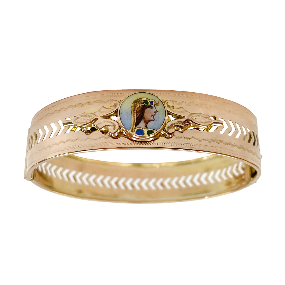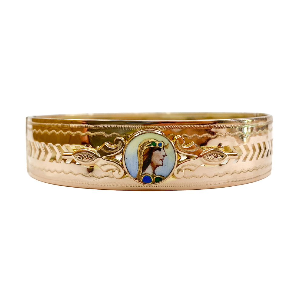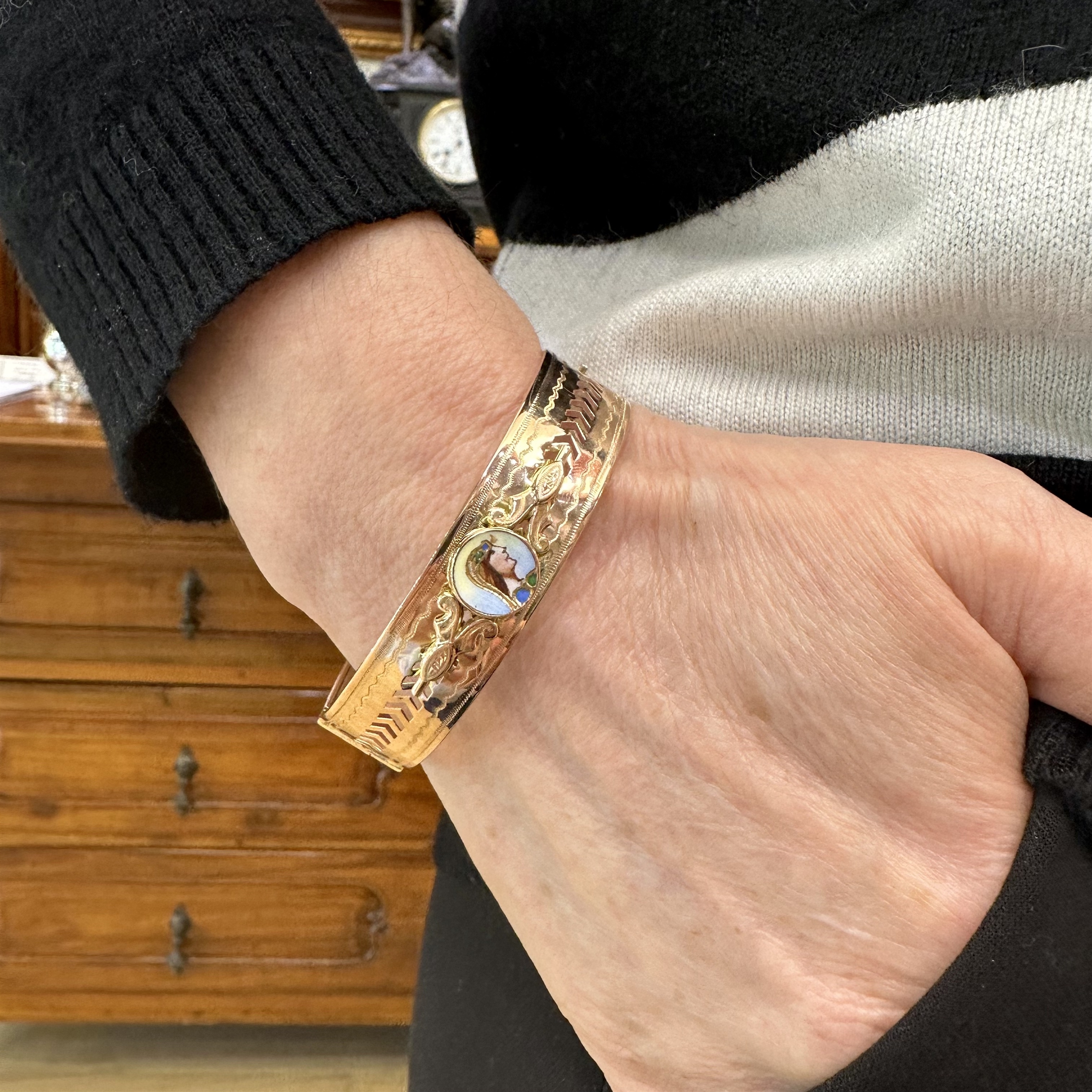 Antico bracciale rigido a fascia di origine borbonica realizzato in oro basso titolo, abilmente lavorato con incisione e traforo a freccia che decora la parte centrale di tutta la fascia. L'elemento decorativo principale è caratterizzato da una base applicata in oro inciso e riporto in smalti raffigurante un raffinato profilo femminile. La chiusura è a scomparsa. Gioiello raffinato che ha mantenuto inalterato il fascino della tradizione orafa dei secoli scorsi, in ottimo stato di conservazione.