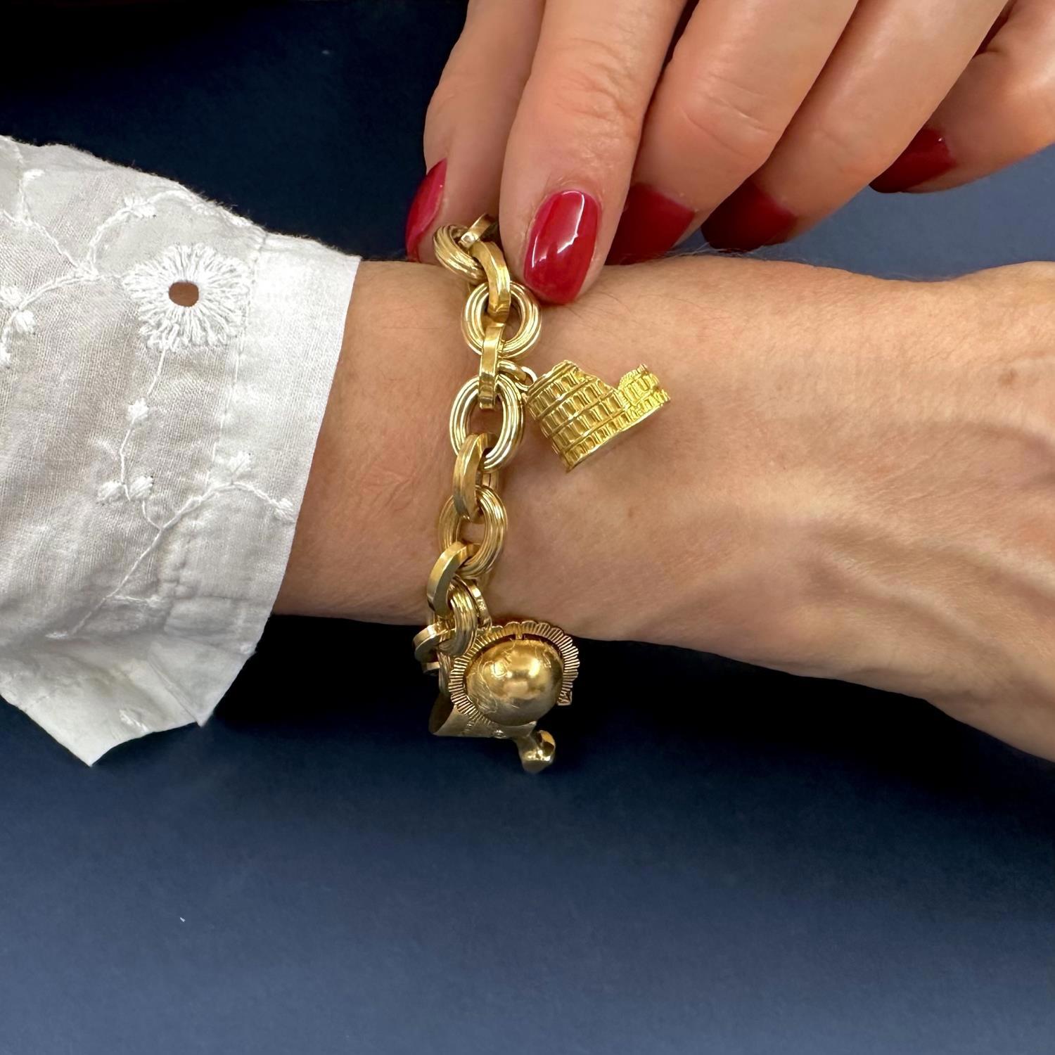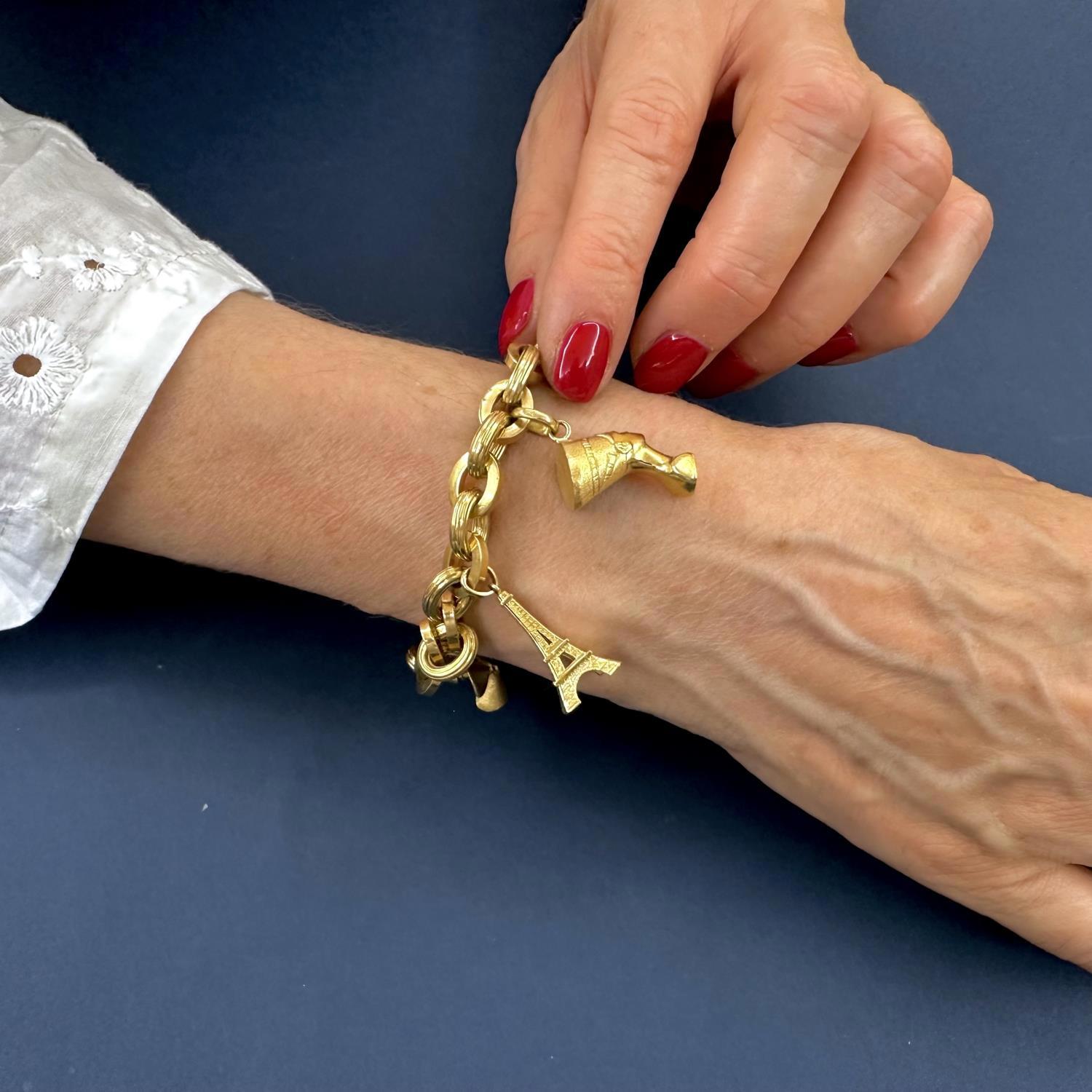Bellissimo bracciale in oro giallo 18 karati realizzato con maglie ovali alternate lisce e scanalate. Fra le maglie sono inseriti cinque ciondoli, anch'essi realizzati in oro 18 karati, raffiguranti il Colosseo, un mappamondo, il busto della regina egiziana Nefertiti, la Tour Eiffel e un'elica nautica, tutti simboli legati ai viaggi. Un moschettone di grandi dimensioni funge da chiusura. Gioiello senza tempo, in perfette condizioni.
