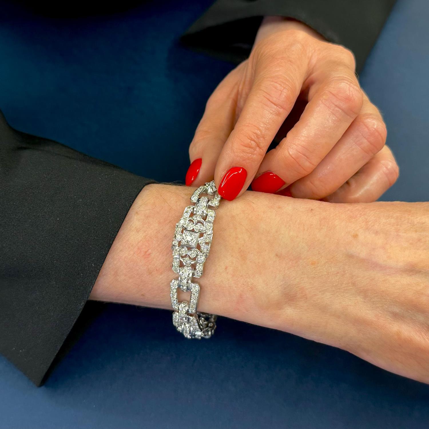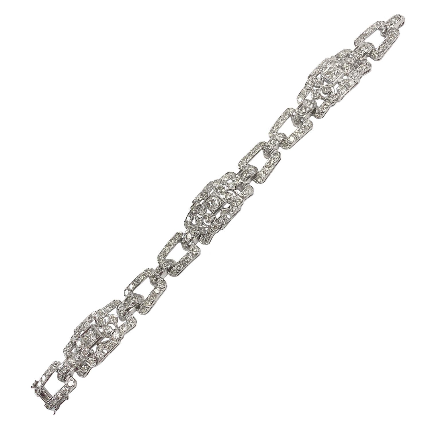 Raffinato bracciale a fascia realizzato negli anni Trenta del Novecento in platino con tre grandi maglie rettangolari alternate a due maglie più piccole concatenate fra loro. Il bracciale è interamente ricoperto da diamanti di taglio antico, in particolare spiccano i tre diamanti posti al centro degli elementi maggiori, stimati ciascuno 0,40 carati. Il resto dei diamanti è stimato complessivamente 8,00 carati. Il gioiello presenta i punzoni del fascio ed è uno splendido esempio della sontuosità dello stile decò in voga in quel periodo. Lo stato di conservazione è ottimo.