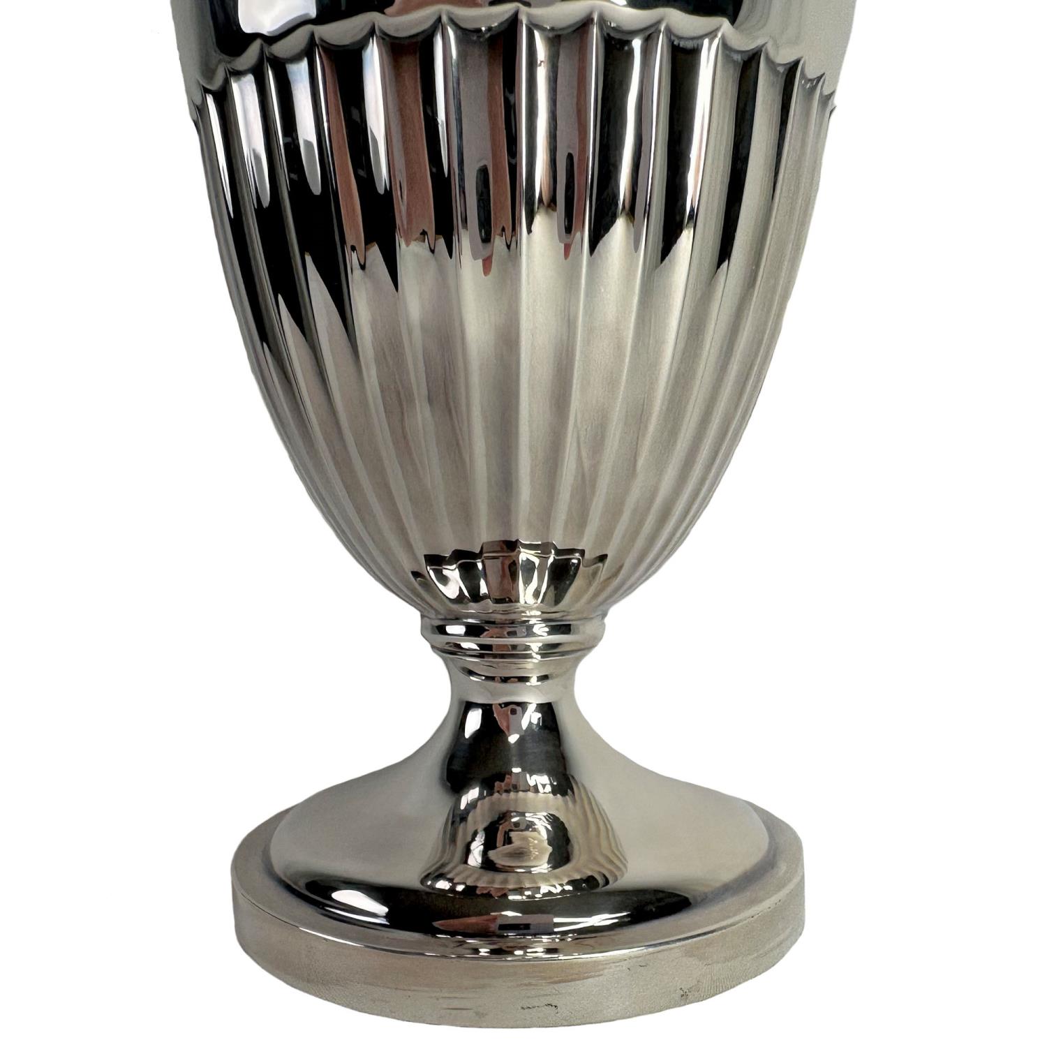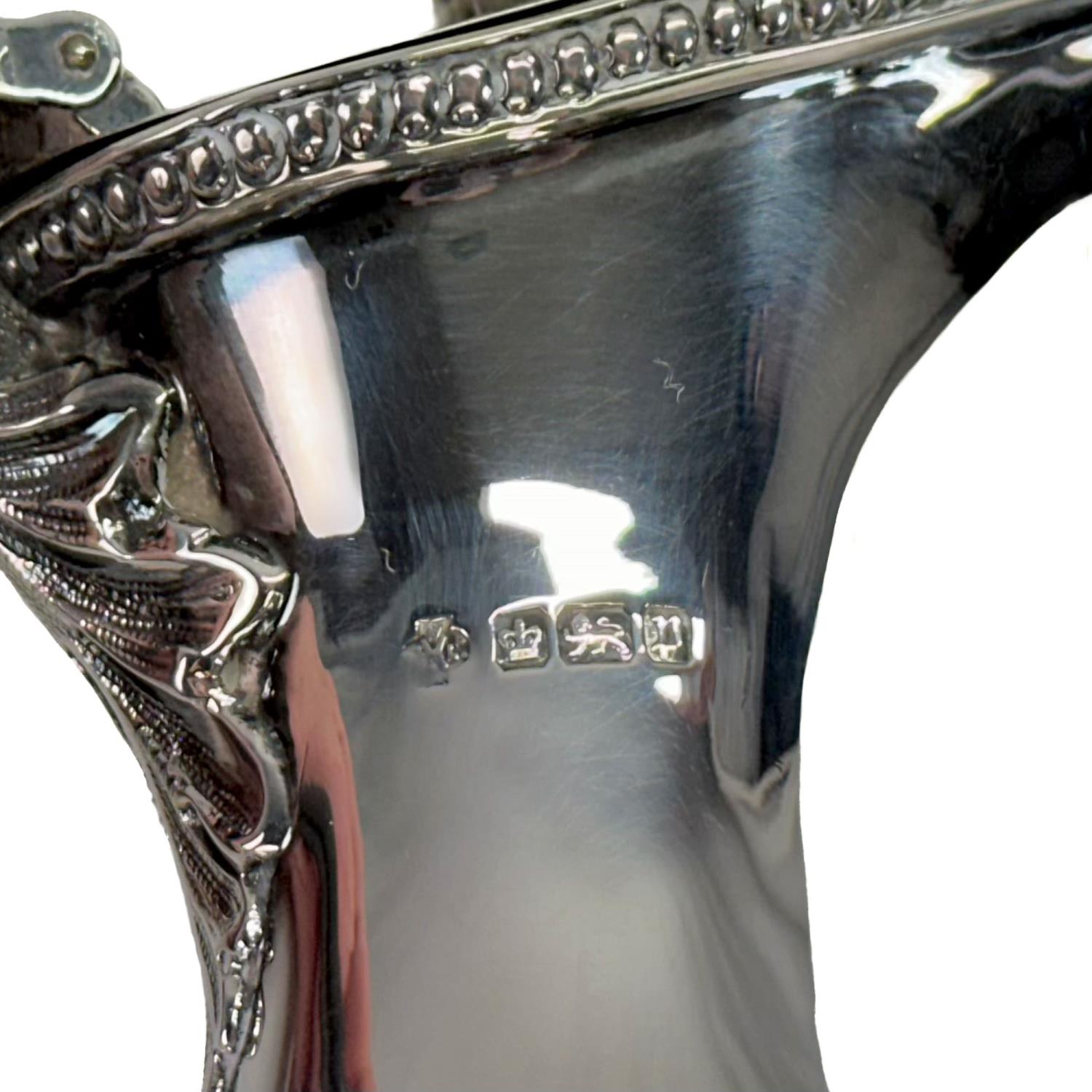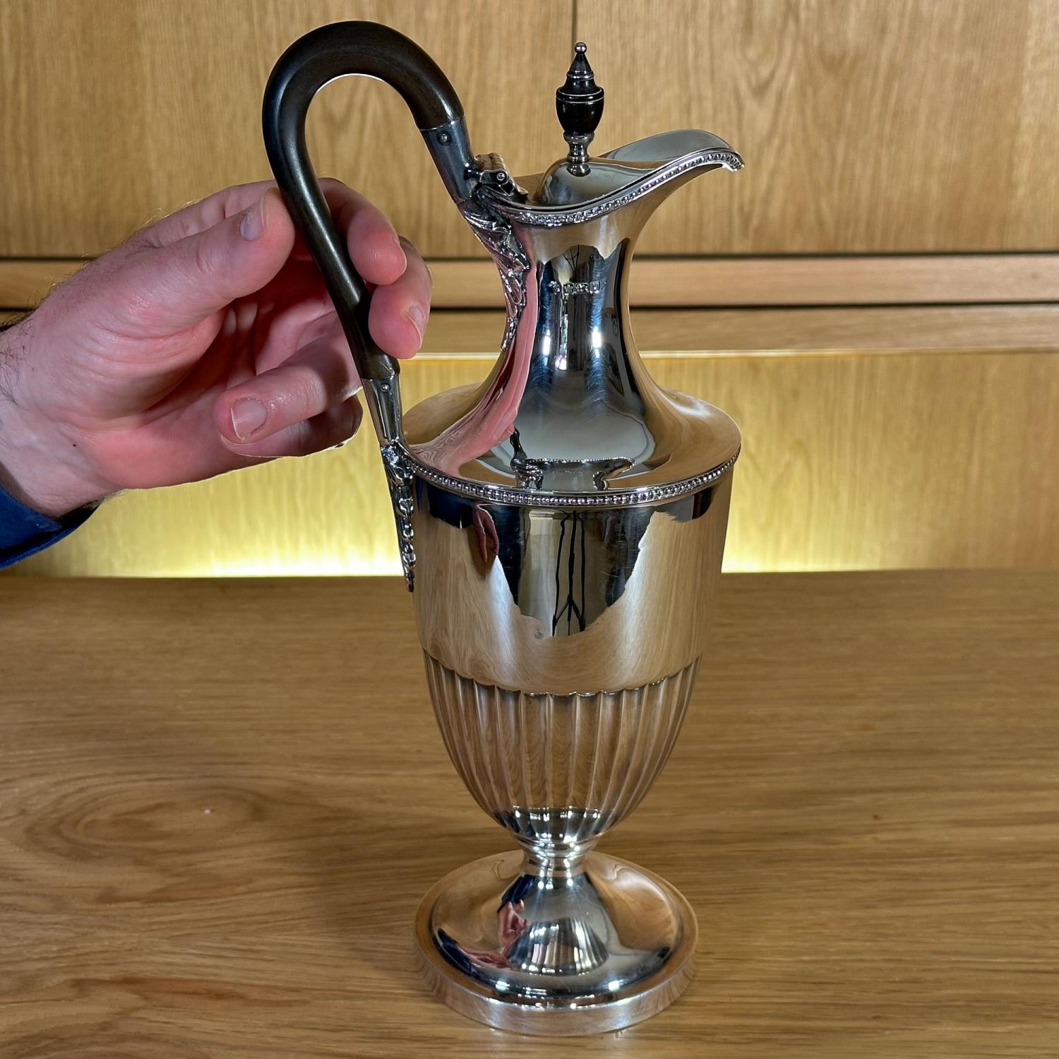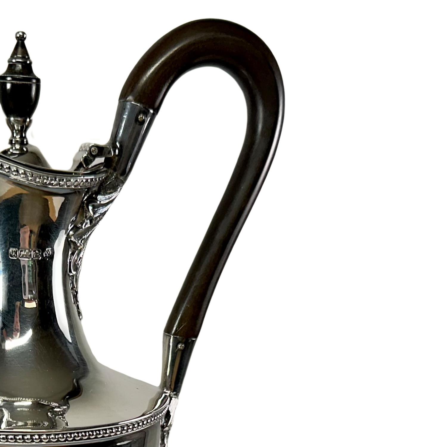 Raffinata caffettiera inglese realizzata in argento a titolo 800 millesimi con punzoni indicanti la città di Sheffield, l'anno di produzione, il 1907, e la manifattura, W. Hutton & Sons. L'eleganza raffinata e sobria che caratterizza questo pezzo è tipica dello stile Edoardo VII che unisce tradizione britannica, gusto neoclassico e influenze dell'Art Nouveau. Il manico, così come la presa del coperchio, sono in legno ebanizzato; il corpo è decorato con delle leggere scanalature e poggia su una base circolare. Splendido esempio di argenteria da tavola, ancora in ottimo stato di conservazione.