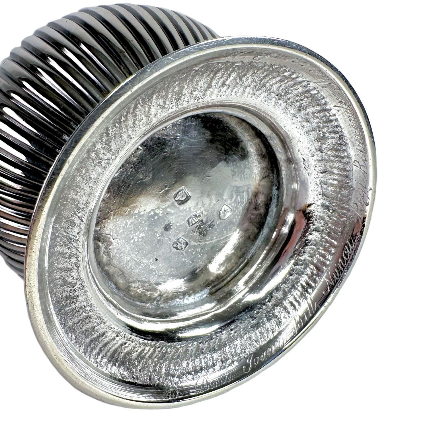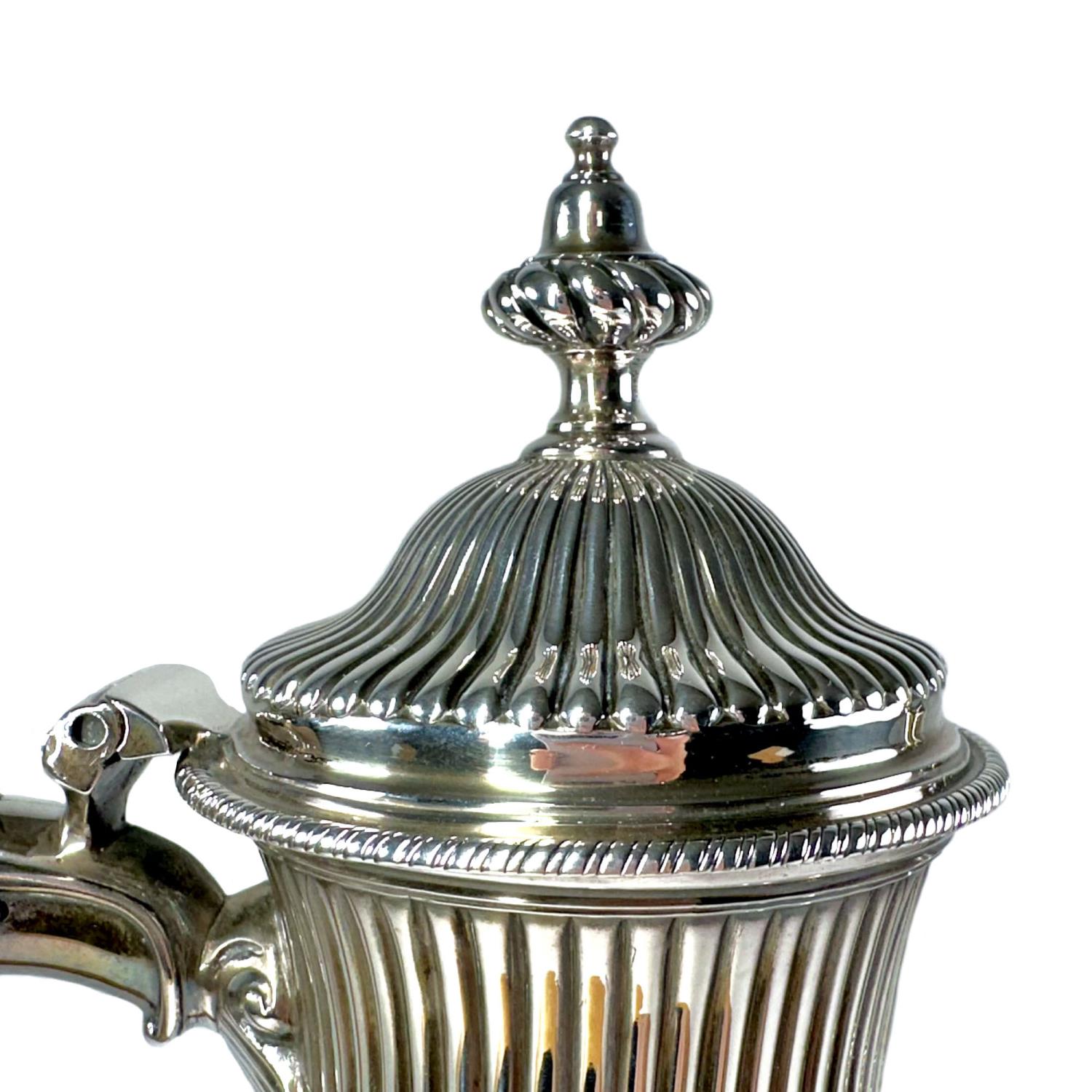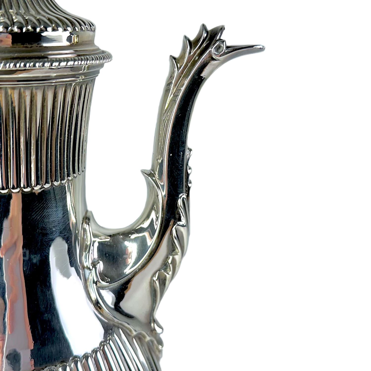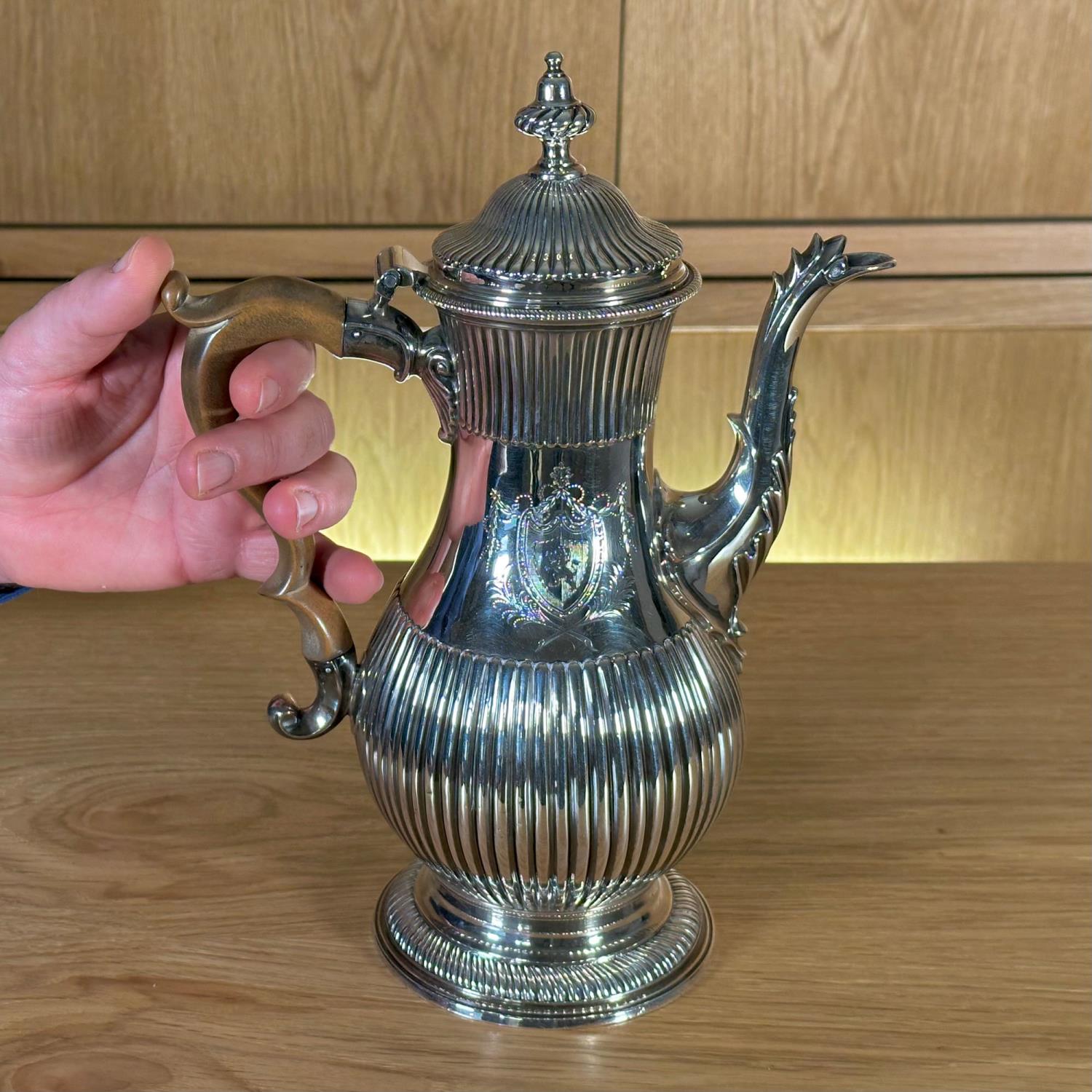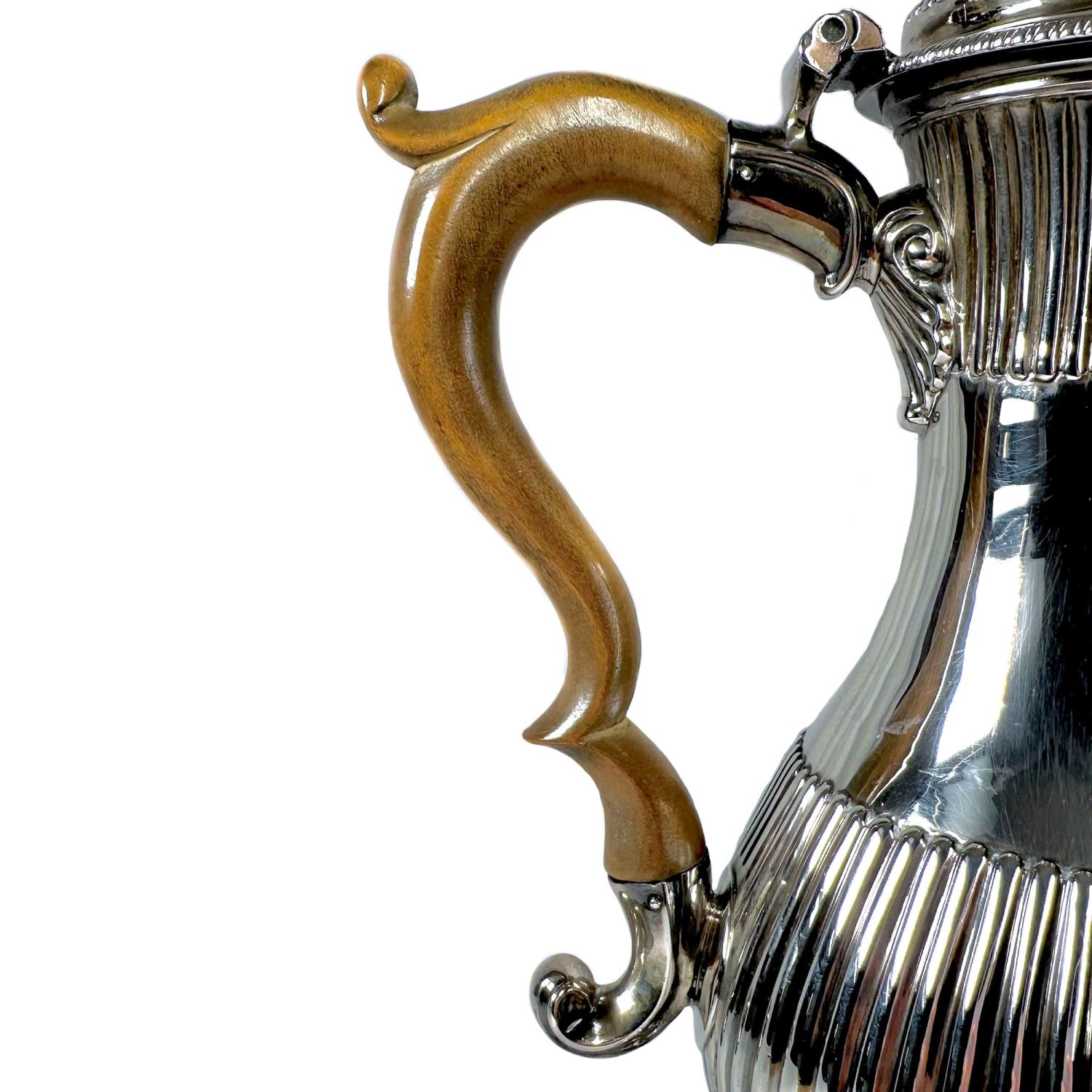 Elegante caffettiera Giorgio III realizzata in argento a titolo 800 millesimi con il punzone della città di Londra, la testa di leopardo con corona, la lettera dell'anno 1770 e il punzone della manifattura Charles Woodward. Elegante e raffinata, è caratterizzata dal corpo a balaustra scanalato poggiante su una base circolare e dal bel manico a voluta in legno chiaro. Il suo particolare beccuccio, chiamato "a collo d'oca" per la sua forma sinuosa arricchita da decori a motivi fogliati, era tipico delle caffettiere del periodo georgiano. Su un lato è presente uno stemma inciso con al centro un leone. Raffinato complemento d'arredo, in ottimo stato di conservazione.