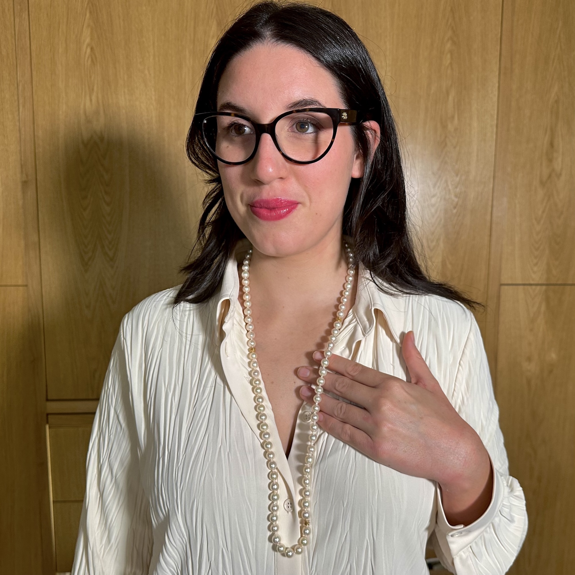 Lunga collana composta da 86 perle Akoya di diametro 8,50-9,00 millimetri dal classico colore bianco crema che presentano qualche leggera picchiettatura che ne attesta l'origine organica. Fra le gemme sono inseriti quattro intermezzi a disco irregolare in oro giallo 18 karati che donano movimento alla collana. Gioiello raffinato, in perfetto stato di conservazione.