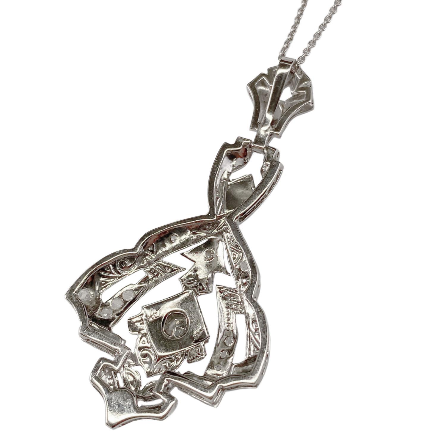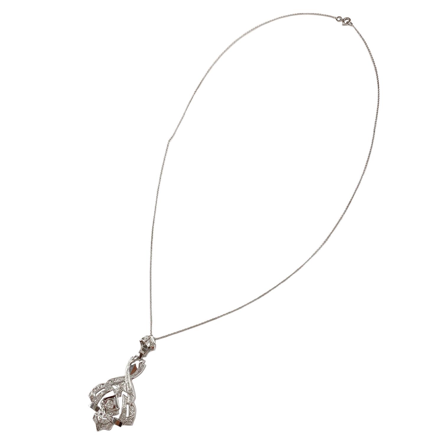 Deliziosa collana realizzata in oro bianco 18 karati, composta da una sottile catenina e da un pendente lavorato a traforo, impreziosito al centro da un diamante di taglio a brillante stimato di 0,20 carati. La superficie del pendente è tutta incisa e illuminata da piccoli diamanti di taglio a rosa. Gioiello molto fine, di buon gusto e in ottimo stato di conservazione.