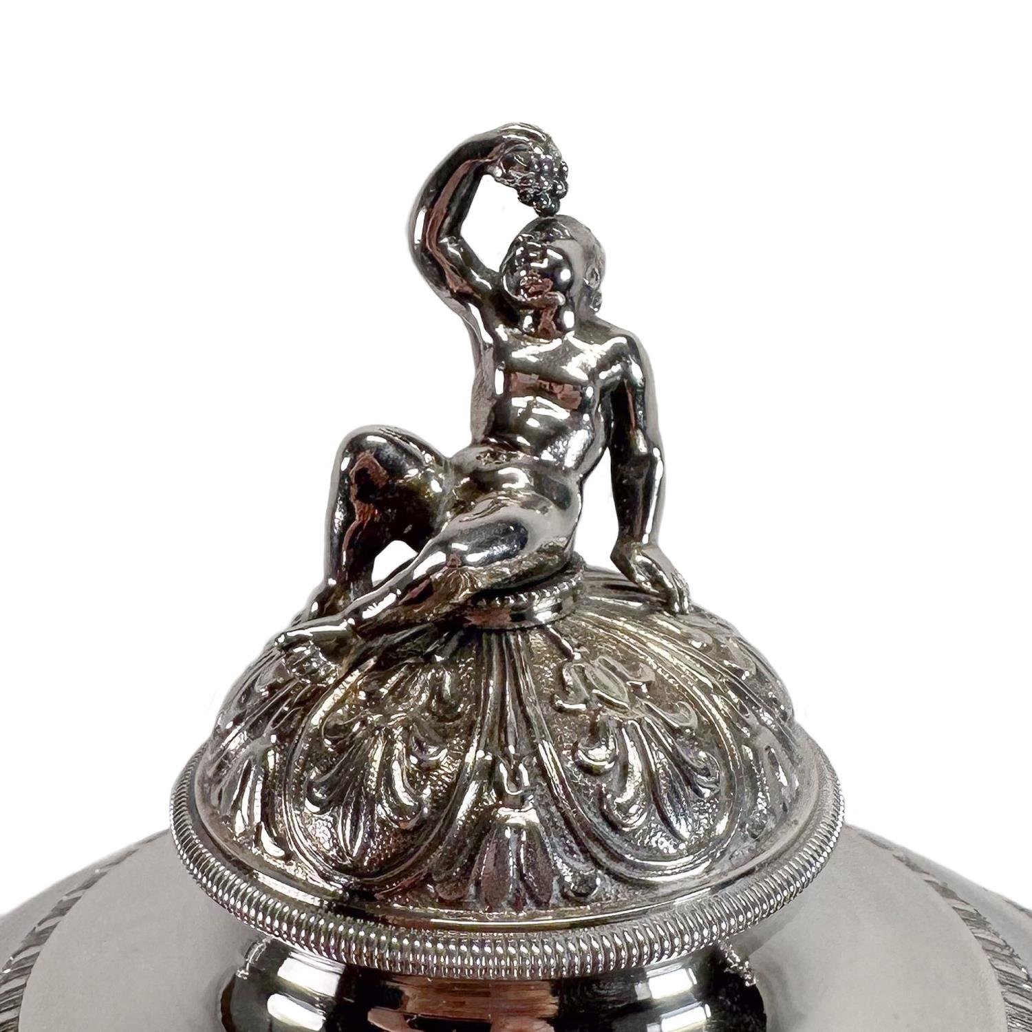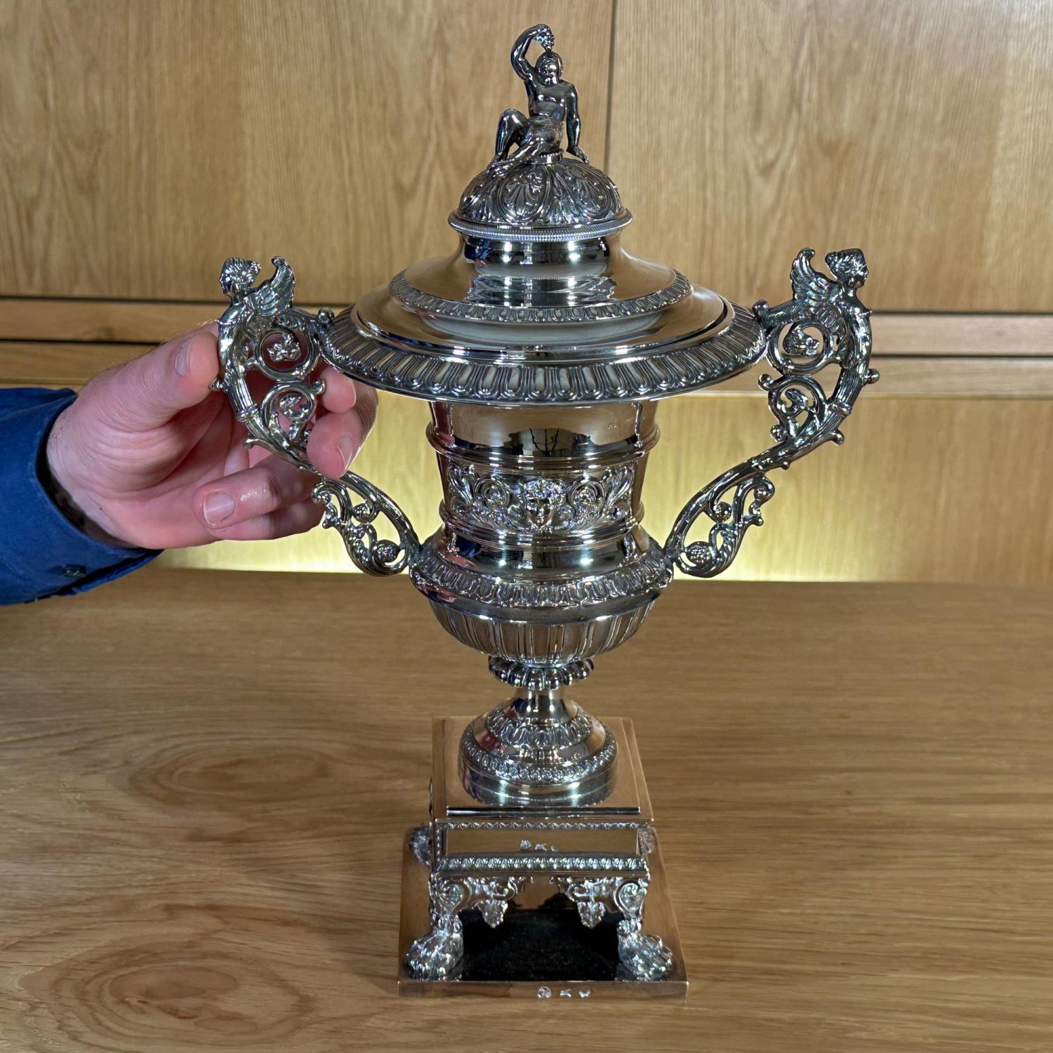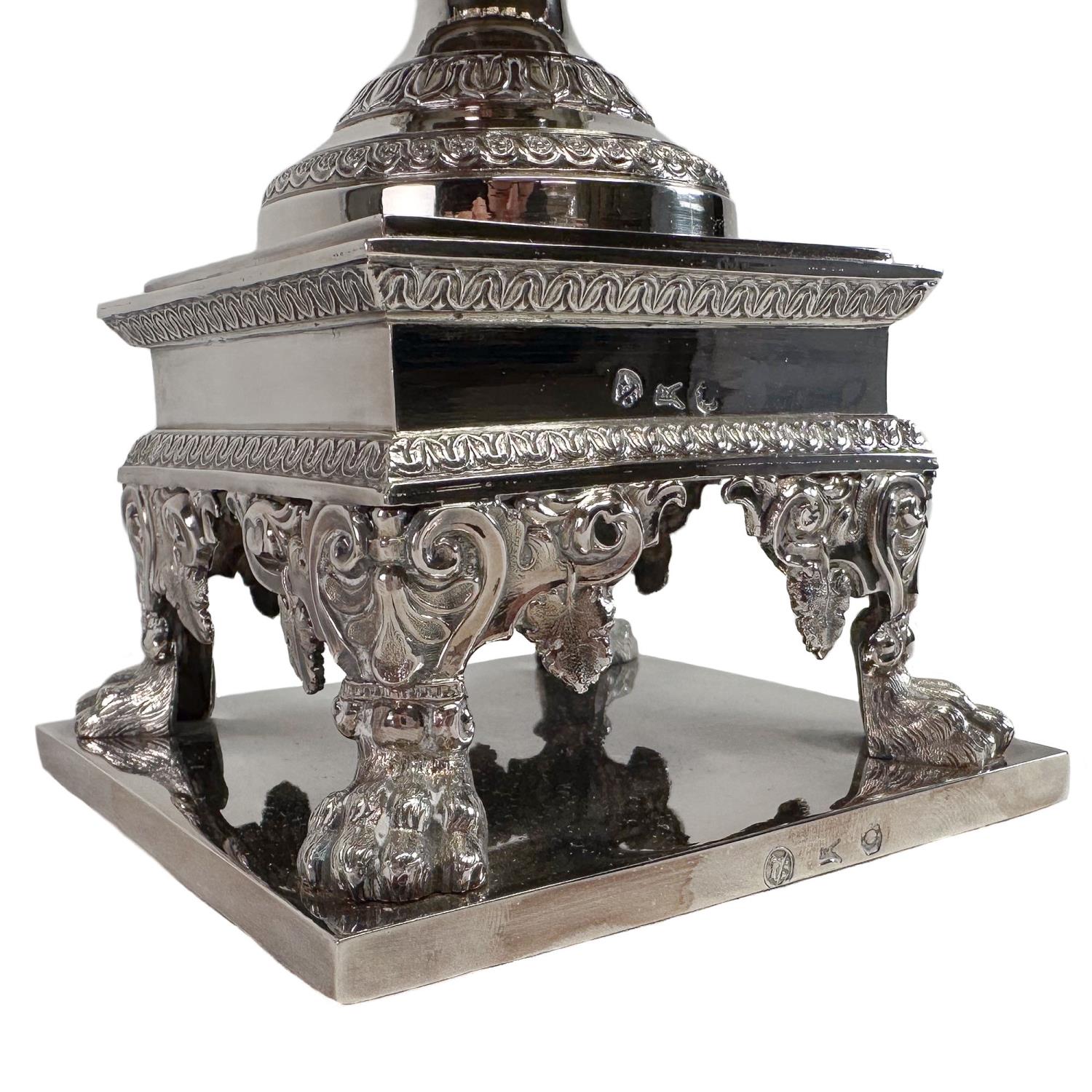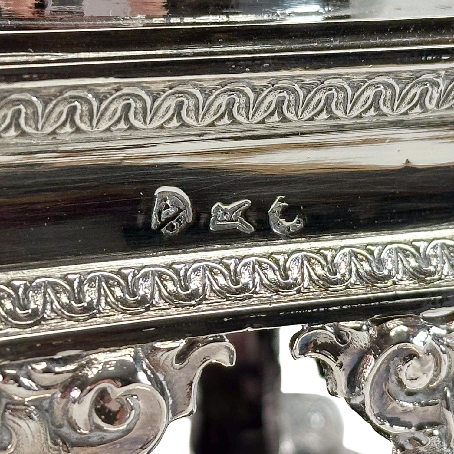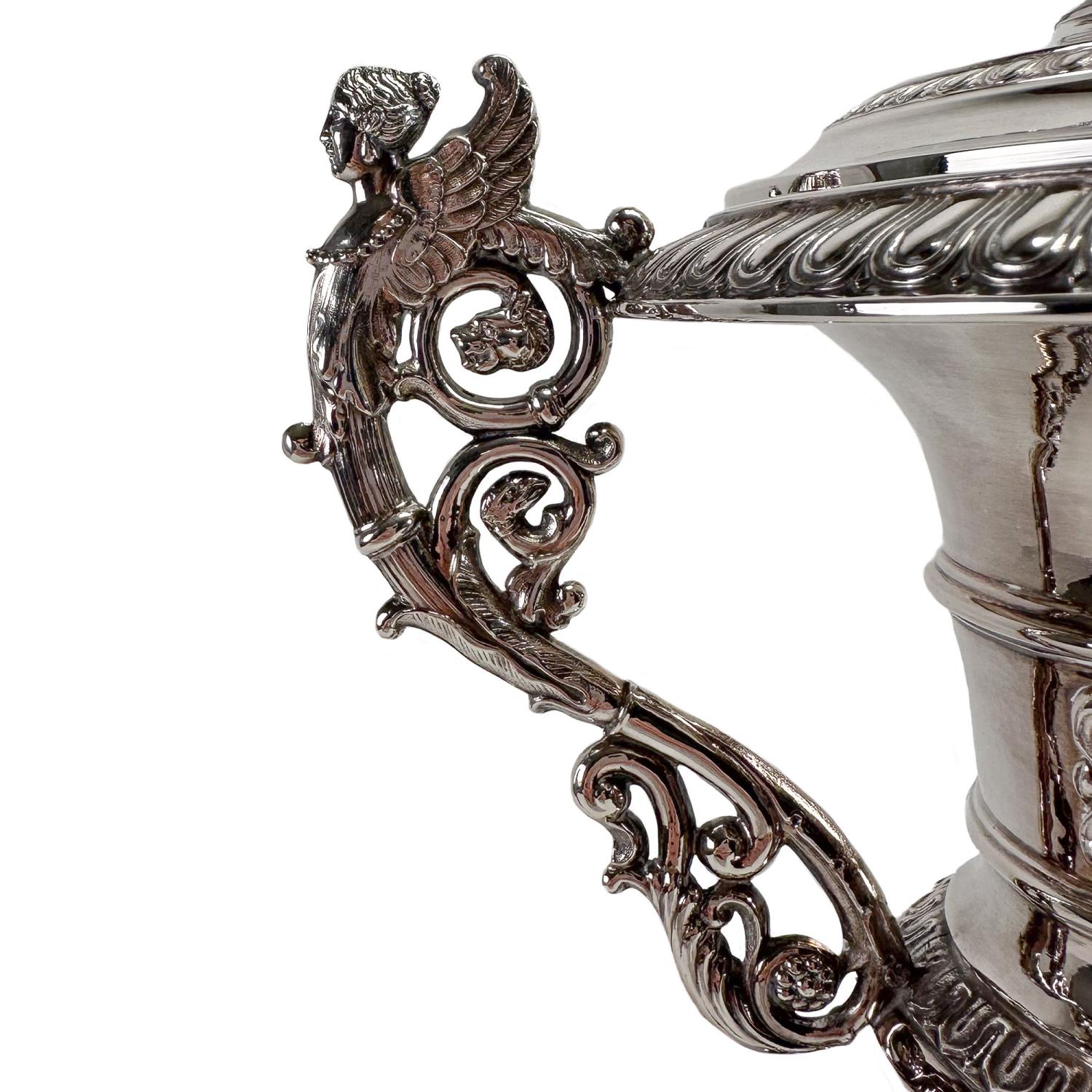 Straordinaria compostiera realizzata in argento a titolo 800 millesimi negli anni '40 del XIX secolo. La forma a vaso con coperchio su base architettonica, completa di zampe ferine, è arricchita da sontuose decorazioni: palmette, ghirlande e altri motivi floreali. I manici a doppia voluta sono decorati da due figure femminili alate, mentre il coperchio culmina in una scultura di donna seduta a tutto tondo. Reca il punzone con una capra che allatta e le lettere TP che identifica l'argentiere Tommaso Panizza, attivo a Milano tra il 1837 e il 1868; il punzone con l'aratro, che era il bollo territoriale usato dall'Ufficio di Garanzia di Milano dal 1812 al 1872; e il punzone con il globo e lo zodiaco, che indica gli argenti del II titolo. Ottimo esempio dell'alta oreficeria italiana pre-unitaria, ancora in perfette condizioni.