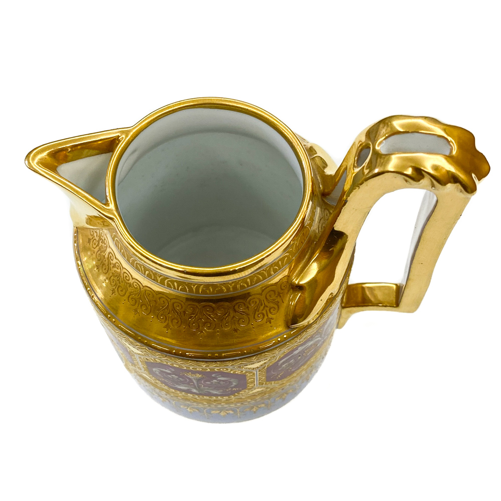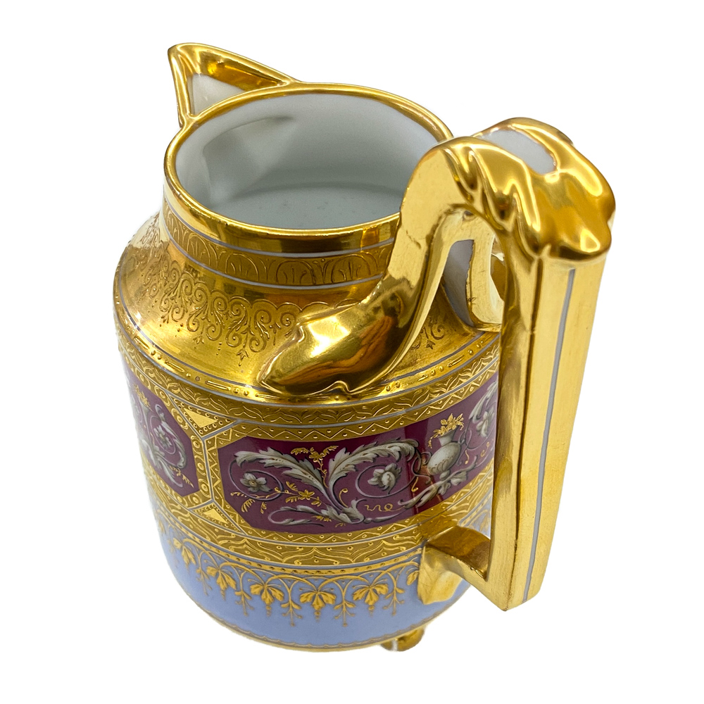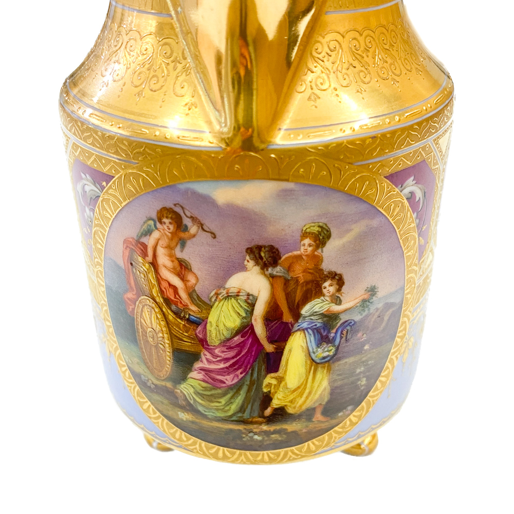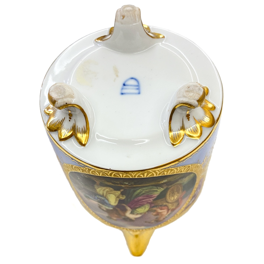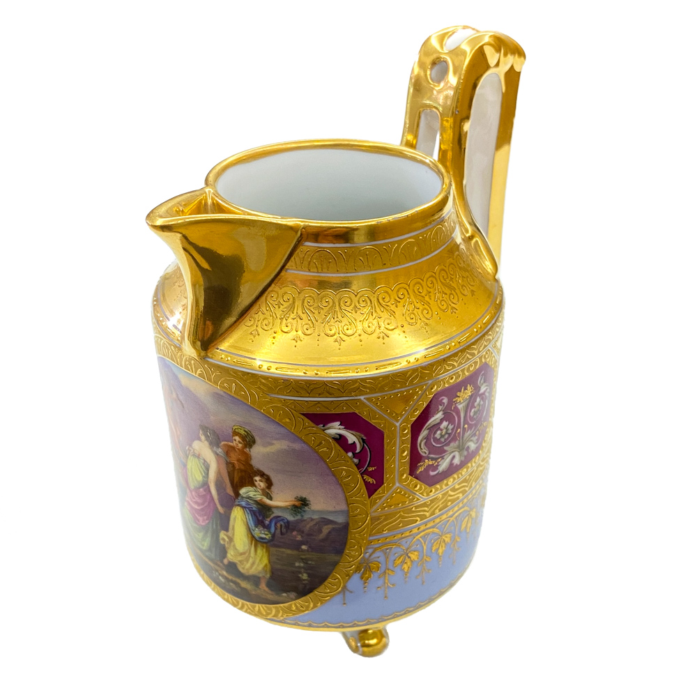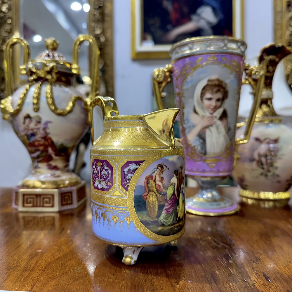 Elegante lattiera in porcellana di forma cilindrica, sostenuta da tre piedini, riccamente decorata nei toni dell'oro, del viola e del celeste con bel dipinto policromo rappresentante una scena tratta dalla mitologia greca. Sul fondo è presente il marchio della manifattura di Vienna. Oggetto di grande raffinatezza, in buono stato di conservazione.