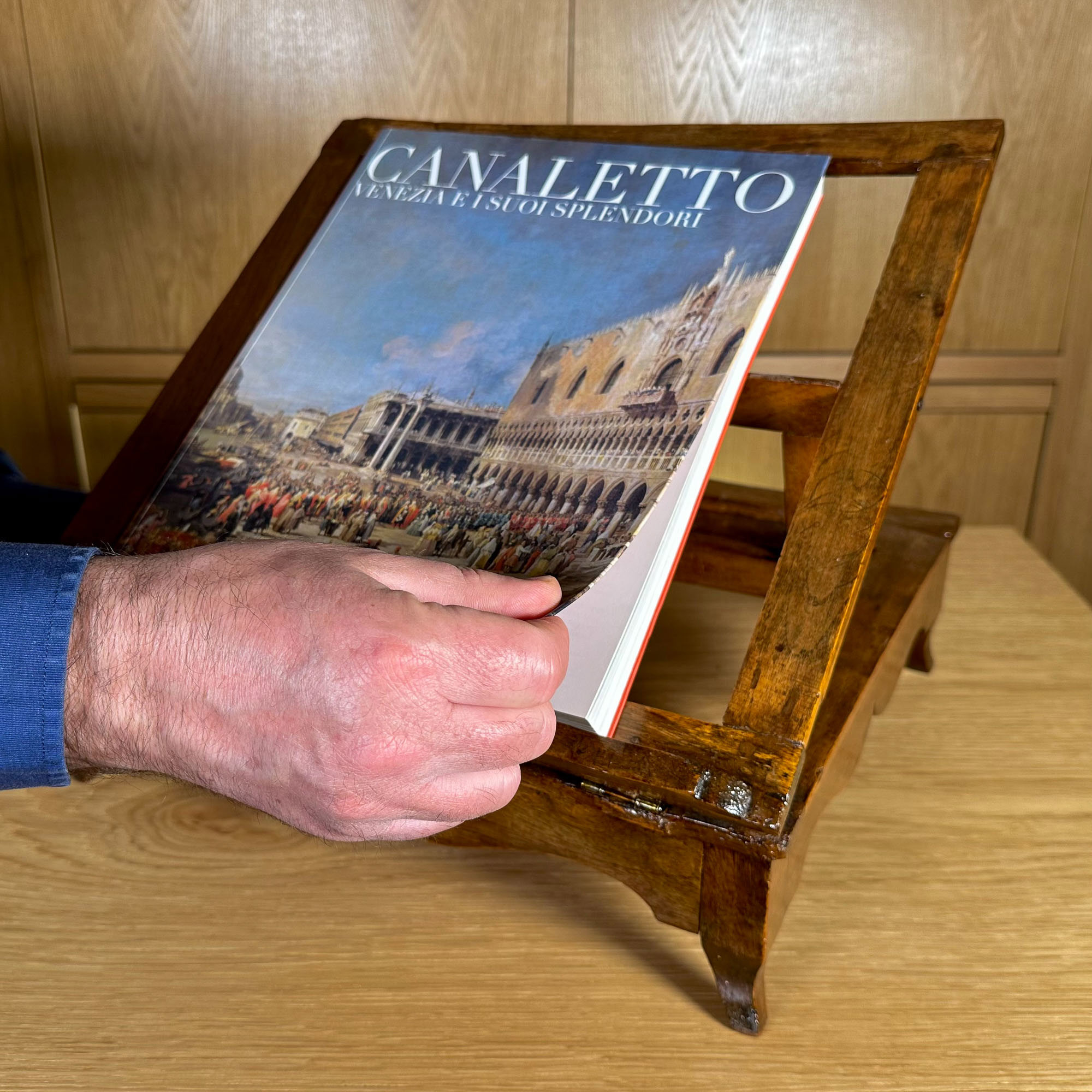 Antico leggio da tavolo realizzato artigianalmente in Italia in legno di noce con finitura lucida. Di struttura solida e consistente, presenta sei livelli di inclinazione regolabili. Il fregio fermalibro e i bordi sono intagliati e creano un piacevole movimento. Adatto anche a grossi tomi, è in buono stato di conservazione.