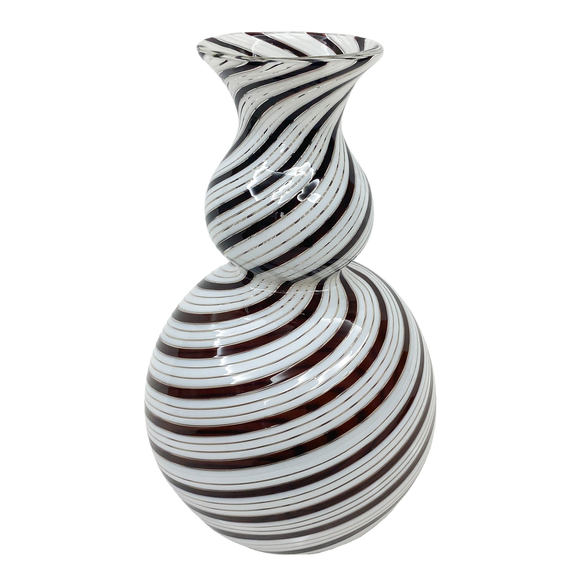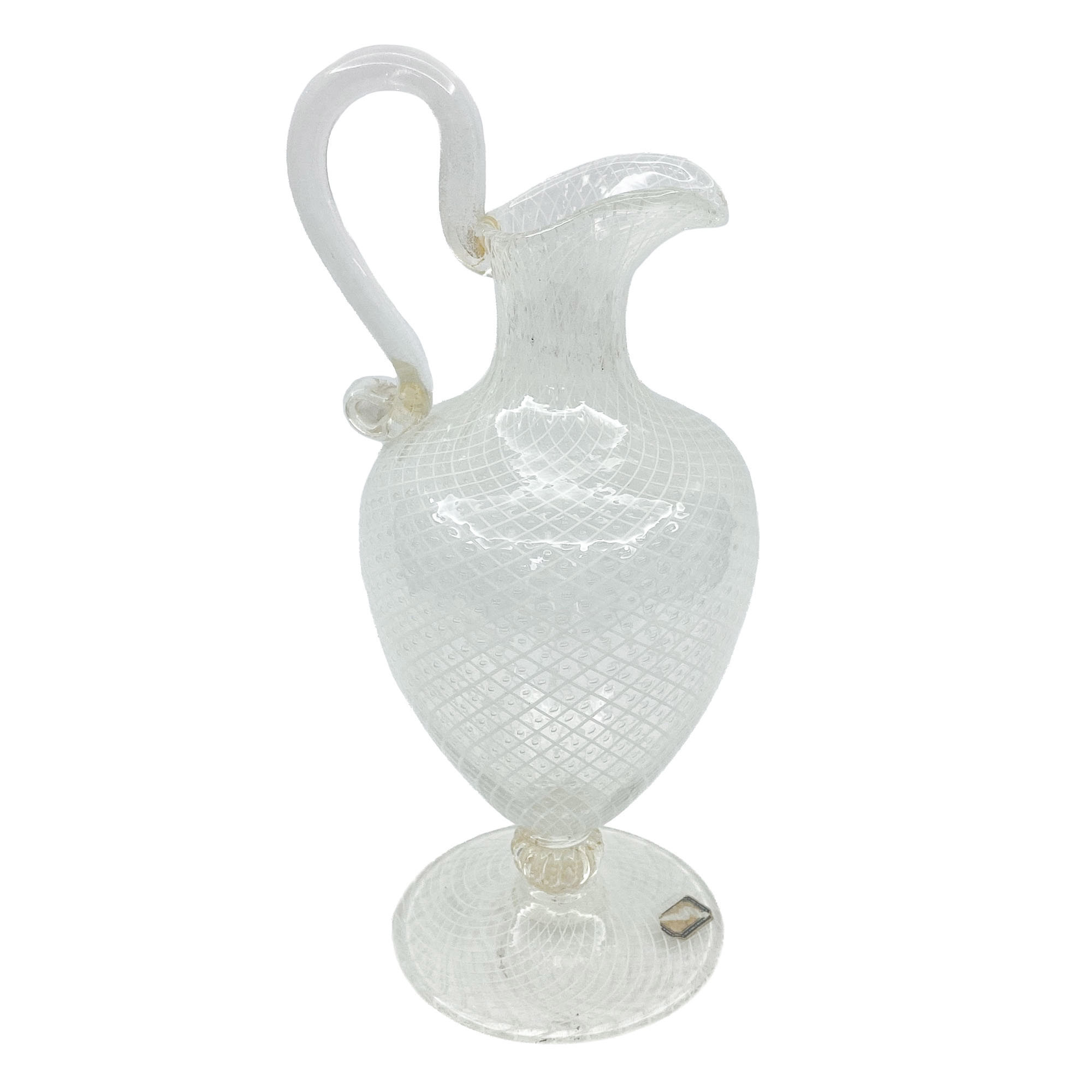 In questa tecnica si parte da una canna che presenta al suo interno diversi strati vitrei concentrici di vario colore e forma, solitamente a fiore o a stella, come in questa simpatica anfora. La canna millefiori viene tagliata in sezioni che, accostate e fuse, si usano per produrre vari oggetti.