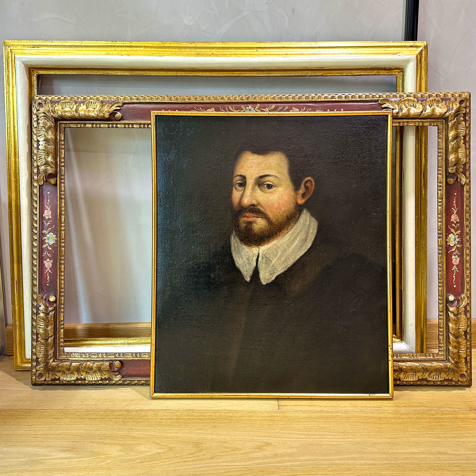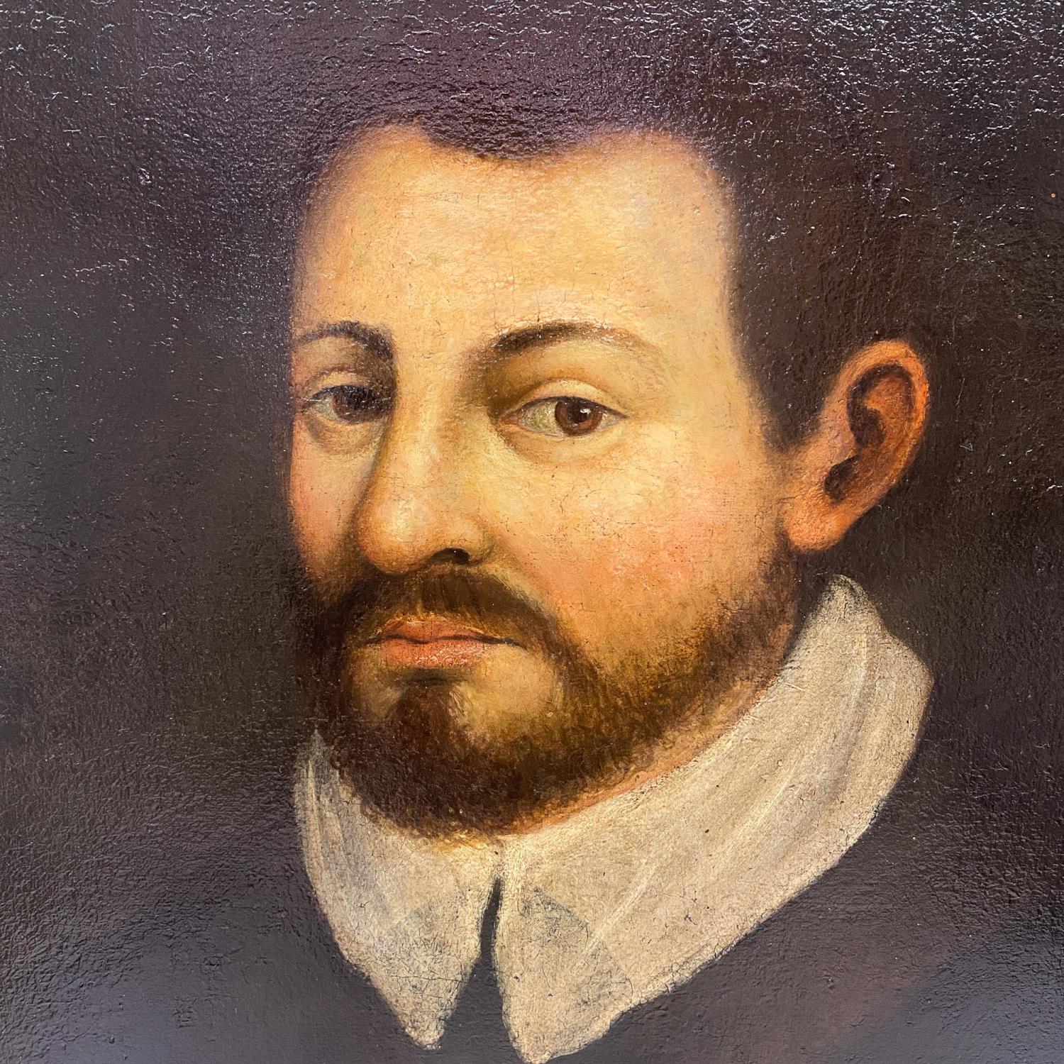 Dipinto ad olio su tela raffigurante un mezzo busto maschile su sfondo scuro come tipico del periodo in cui è stato realizzato, la prima metà del XVII secolo. Il soggetto ha il busto e il volto leggermente girati verso destra, ma il suo sguardo è rivolto verso lo spettatore. Sugli abiti e lo sfondo scuri spicca l'incarnato roseo, messo ulteriormente in risalto dal colletto bianco. L'opera è accompagnata da una semplice cornice dorata, sicuramente di recente fattura, ed è in ottimo stato di conservazione.