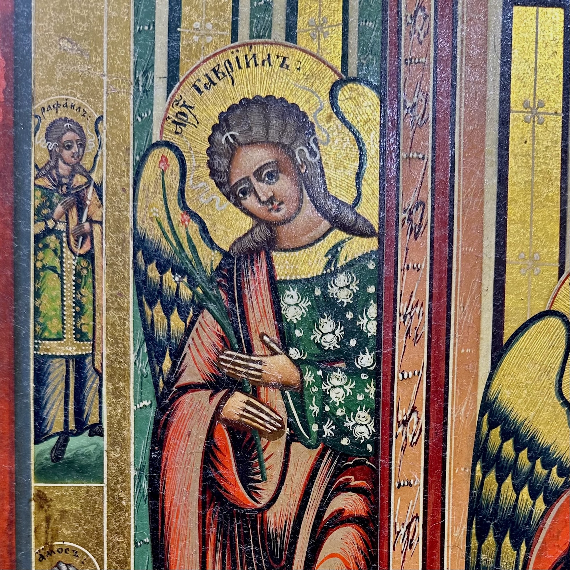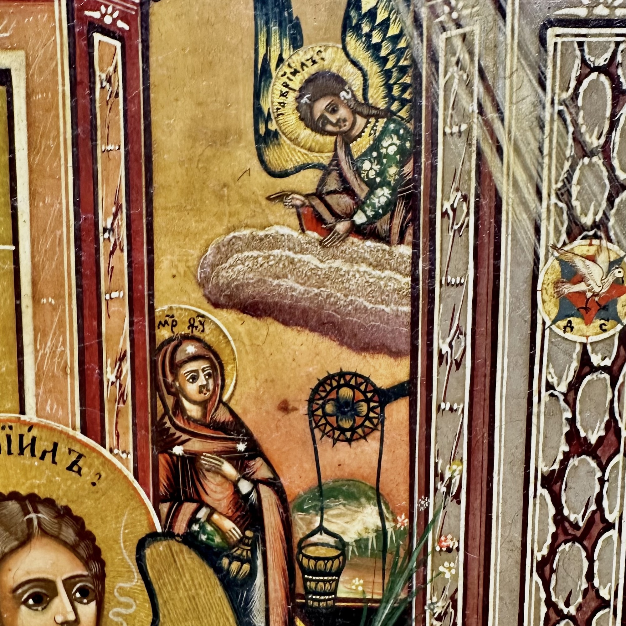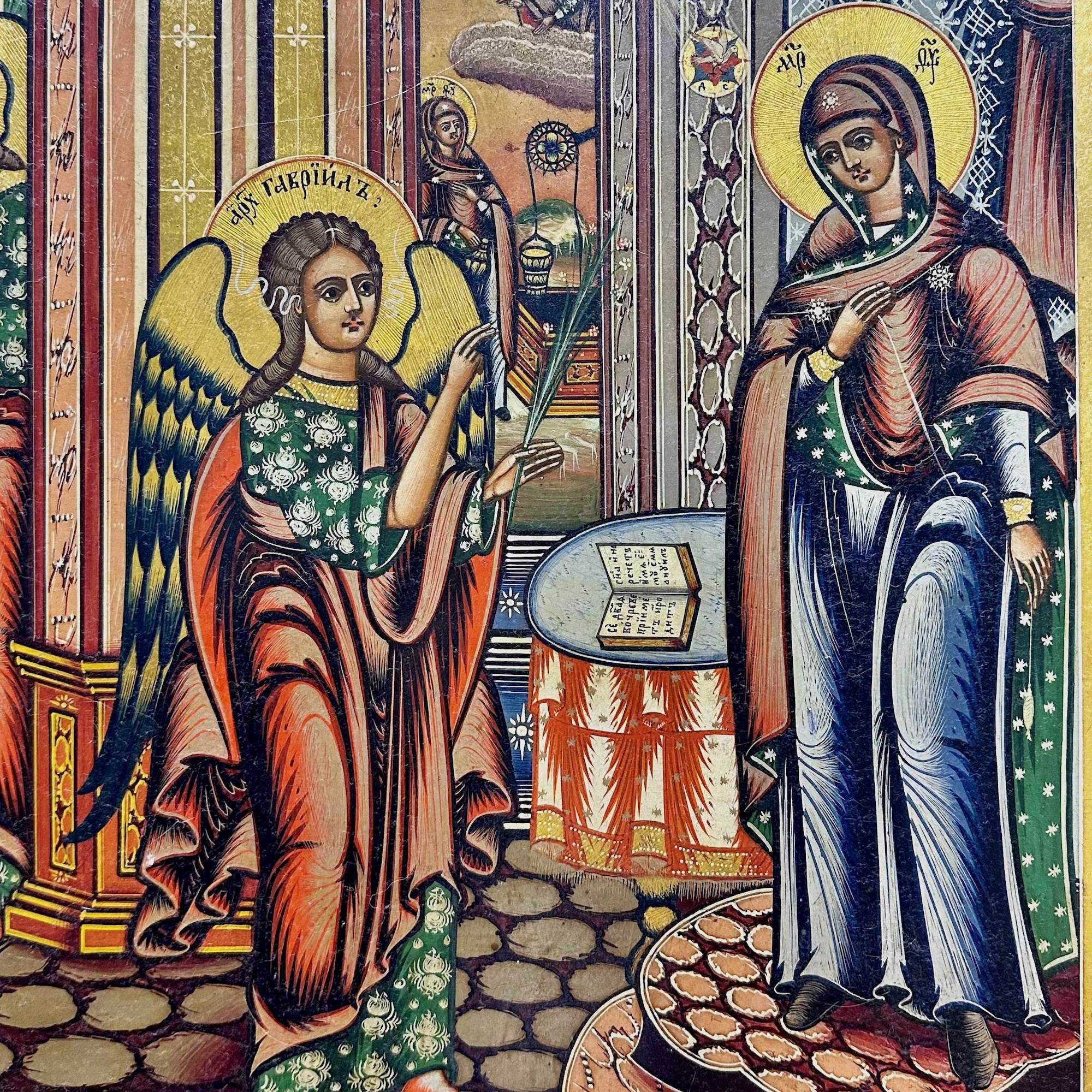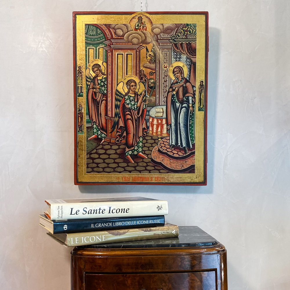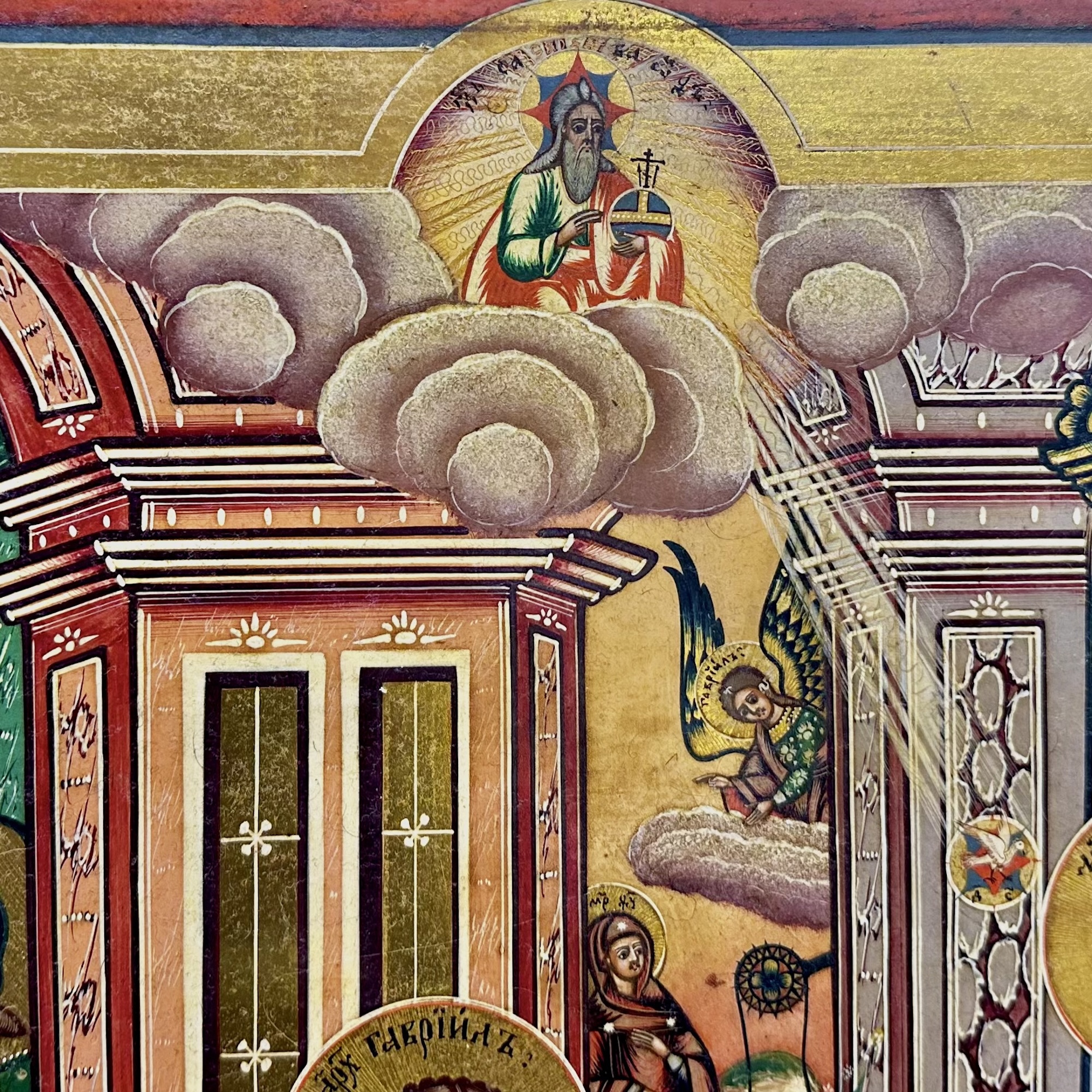 Autentica icona russa di grandi dimensioni realizzata con colori vivaci su fondo oro zecchino. Il motivo iconografico si riferisce all'Annunciazione dell'Angelo a Maria che diventerà Madre di Dio per opera dello Spirito Santo. L'arcangelo Gabriele è rappresentato in tre momenti diversi: sullo sfondo mentre osserva la giovane Maria al pozzo, poi mentre si avvicina alla sua dimora e infine, in primo piano, mentre le dà il messaggio di cui è portatore. Sulla parte superiore è rappresentato il Padre e la discesa della Spirito Santo su Maria. Si tratta di un' icona realizzata probabilmente verso gli ultimissimi anni del 1800 attribuibile alla Scuola di Vetka, in perfetto stato di conservazione.