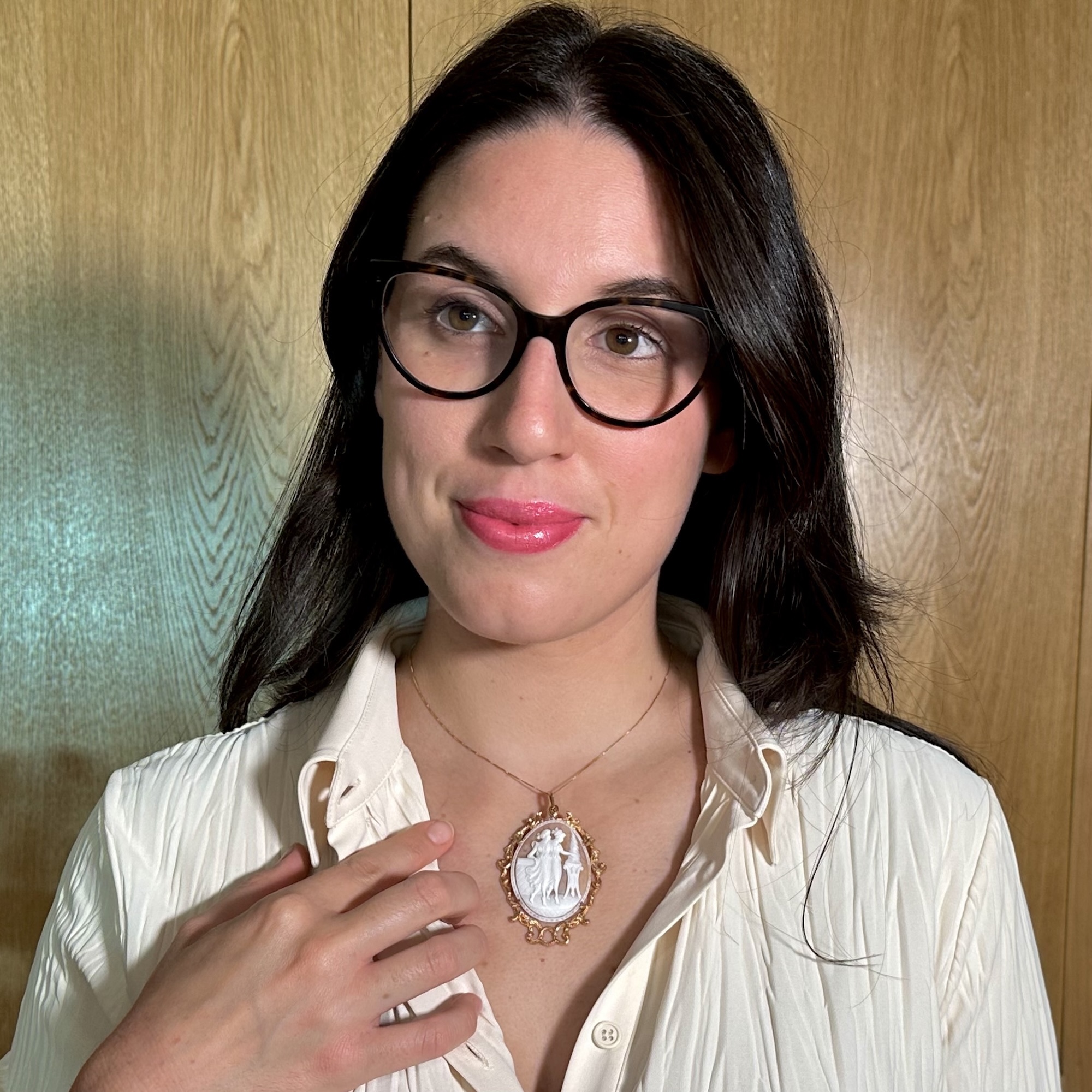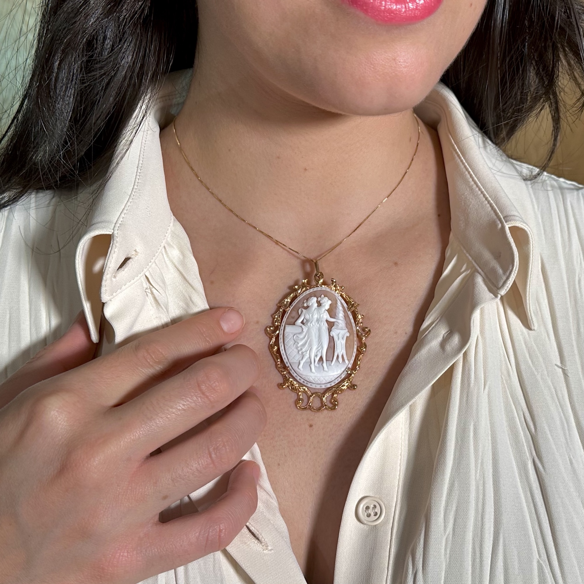 Raffinato pendente con al centro un bellissimo cammeo di conchiglia incorniciato in oro 18 karati. Il cammeo, realizzato nel periodo Liberty, ha incise al bulino, da abili artigiani, due figure femminili che, leggiadre, si avvicinano a un tripode di fuoco. La gemma è inserita su una cornice in oro rosa con un motivo di tralci e foglie incisi e satinati, eseguita attorno alla metà del Novecento. Il cammeo è un monile con una storia e una tradizione molto antica che ancora oggi regala molto charme a chi lo indossa.
