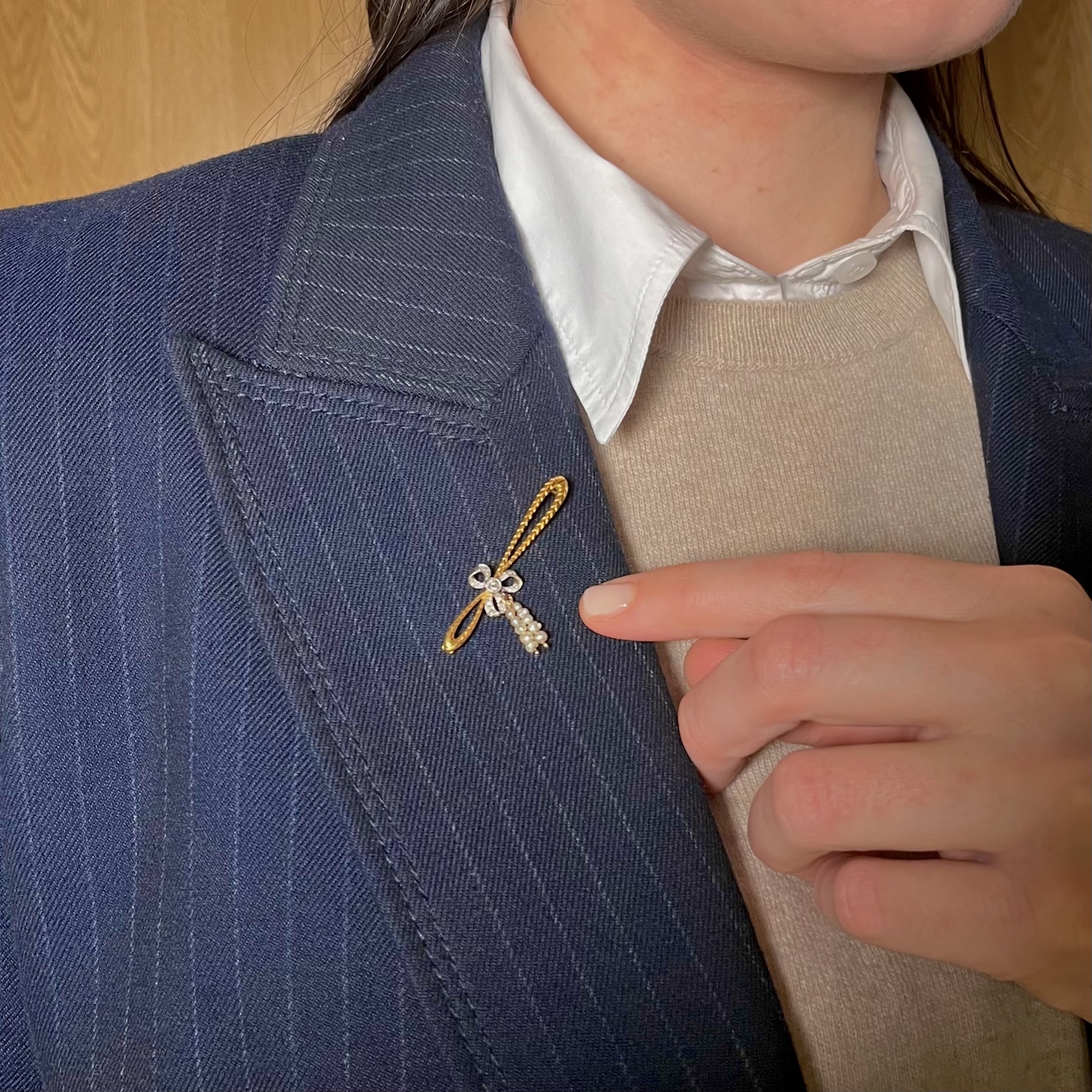 Bellissima spilla in oro giallo e bianco 18 karati a forma di nastro con fiocco a tre asole impreziosito da diamanti e due fili di perle naturali che scendono libere. Raffinato esempio della maestria artigianale orafa degli inizi del secolo scorso, in ottimo stato di conservazione.