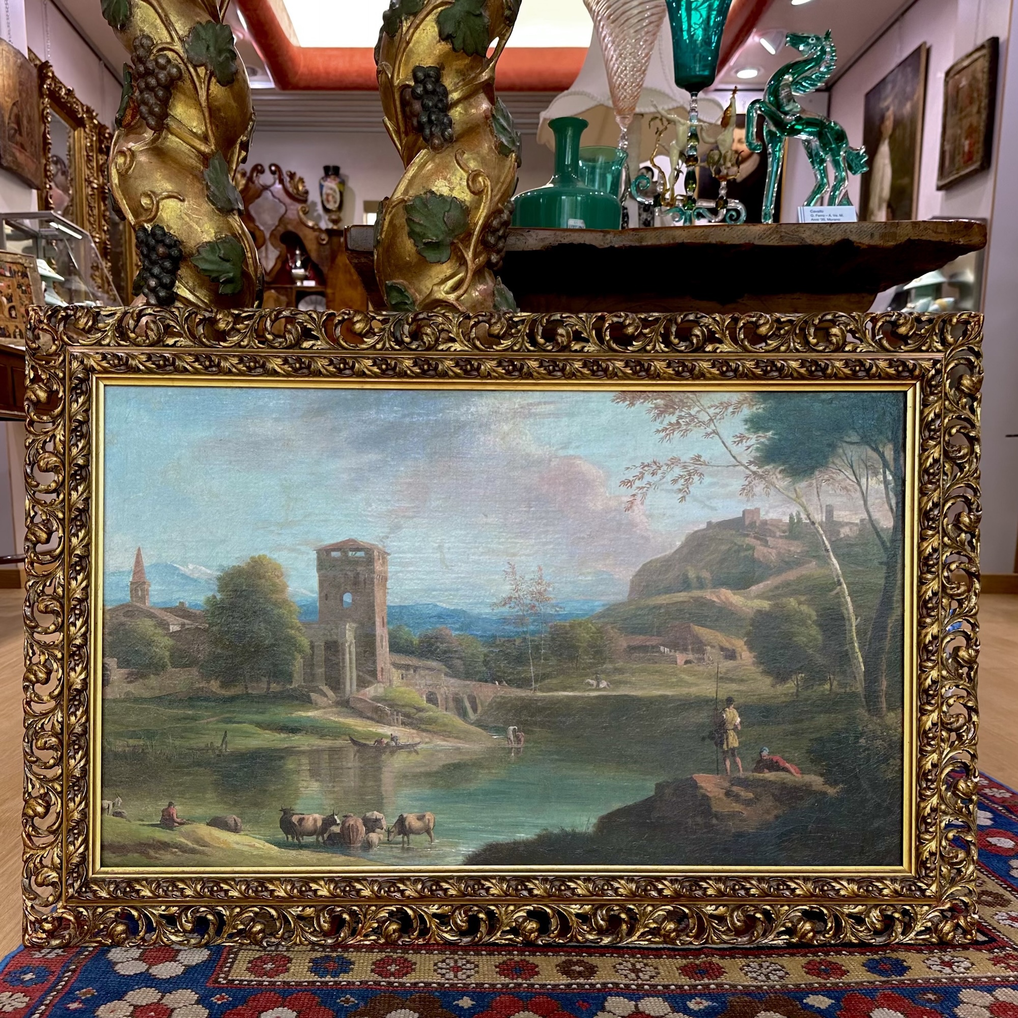 Refined oil on canvas depicting an Arcadian landscape characterized by ruins, vegetation, and figures rendered with balance and clarity. The composition revolves around the central body of water, which reflects a ruined tower and an arched bridge, elements that lead the viewer’s eye toward the hilltop village in the distance. In the foreground, shepherds and animals fording the stream animate the scene with a quiet rhythm, while an elegant tree to the side acts as a scenic backdrop and structures the depth of the painting. The iconographic layout recalls both the celebrated model of Marco Ricci, in particular his Campagna romana con rovine e laghetto, preserved at the Querini Stampalia Foundation in Venice, and the tradition of the ideal landscape established by Claude Lorrain, echoed here in the clarity of the sky, the harmony between nature and architecture, and the composure of the figures. The painting can be placed within the Veneto area due to its diffused luminosity, the harmonious construction of the landscape, and the characteristic integration of ruins, nature, and small pastoral figures, which are central elements of eighteenth‑century Venetian paintings. The work, presented in a gilded frame, is in excellent condition.