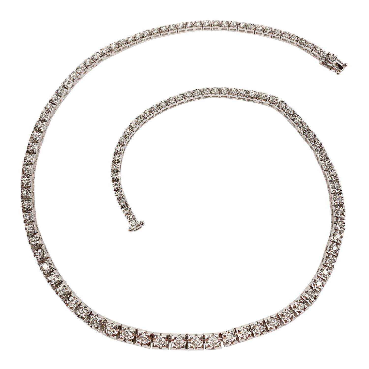 Gorgeous tennis necklace made of 18 karat white gold with 115 brilliant-cut diamonds that weigh a total of 4.10 carats. The gems are graduated from the center and are set on square bezels; the clasp is hidden. Highly elegant jewel, in excellent condition.