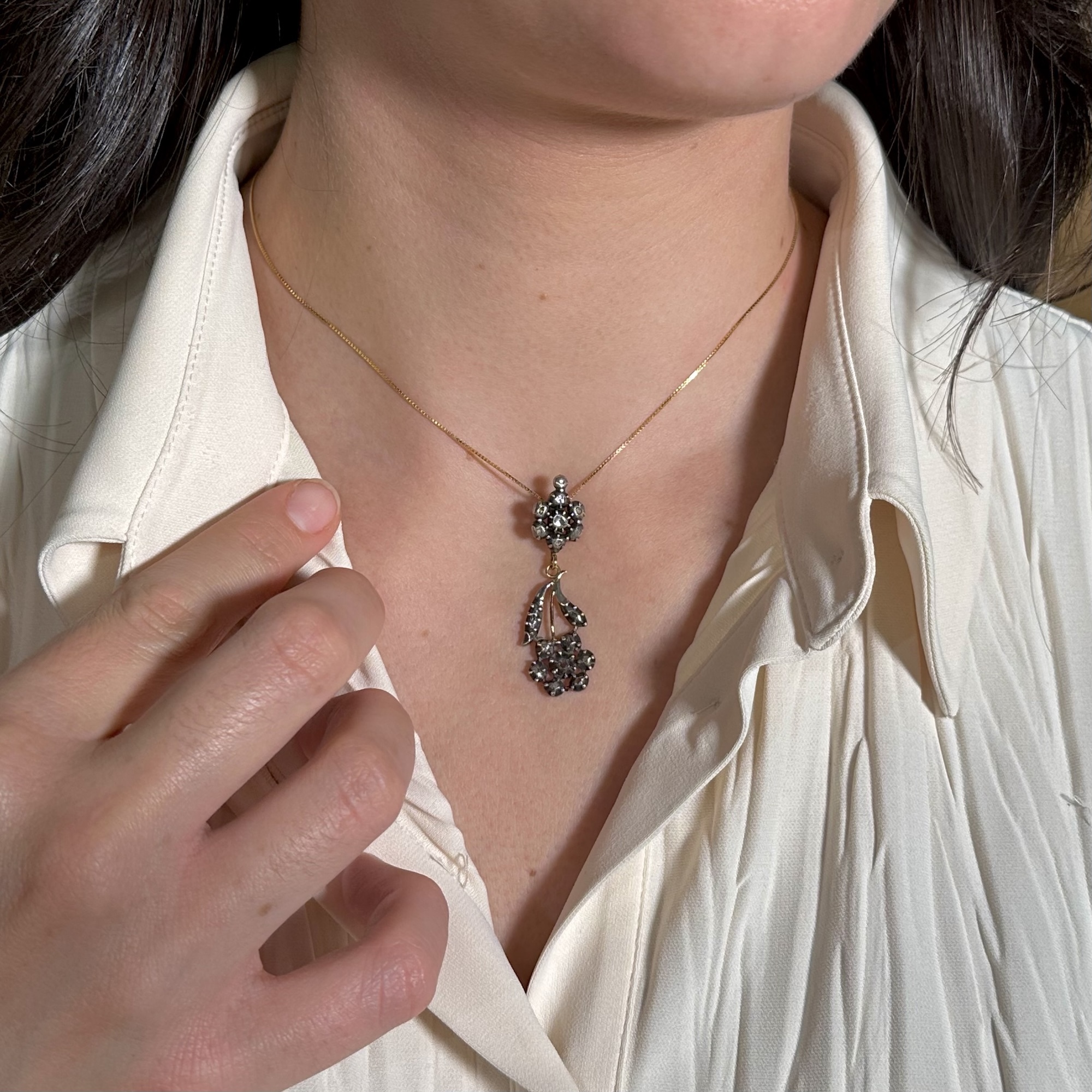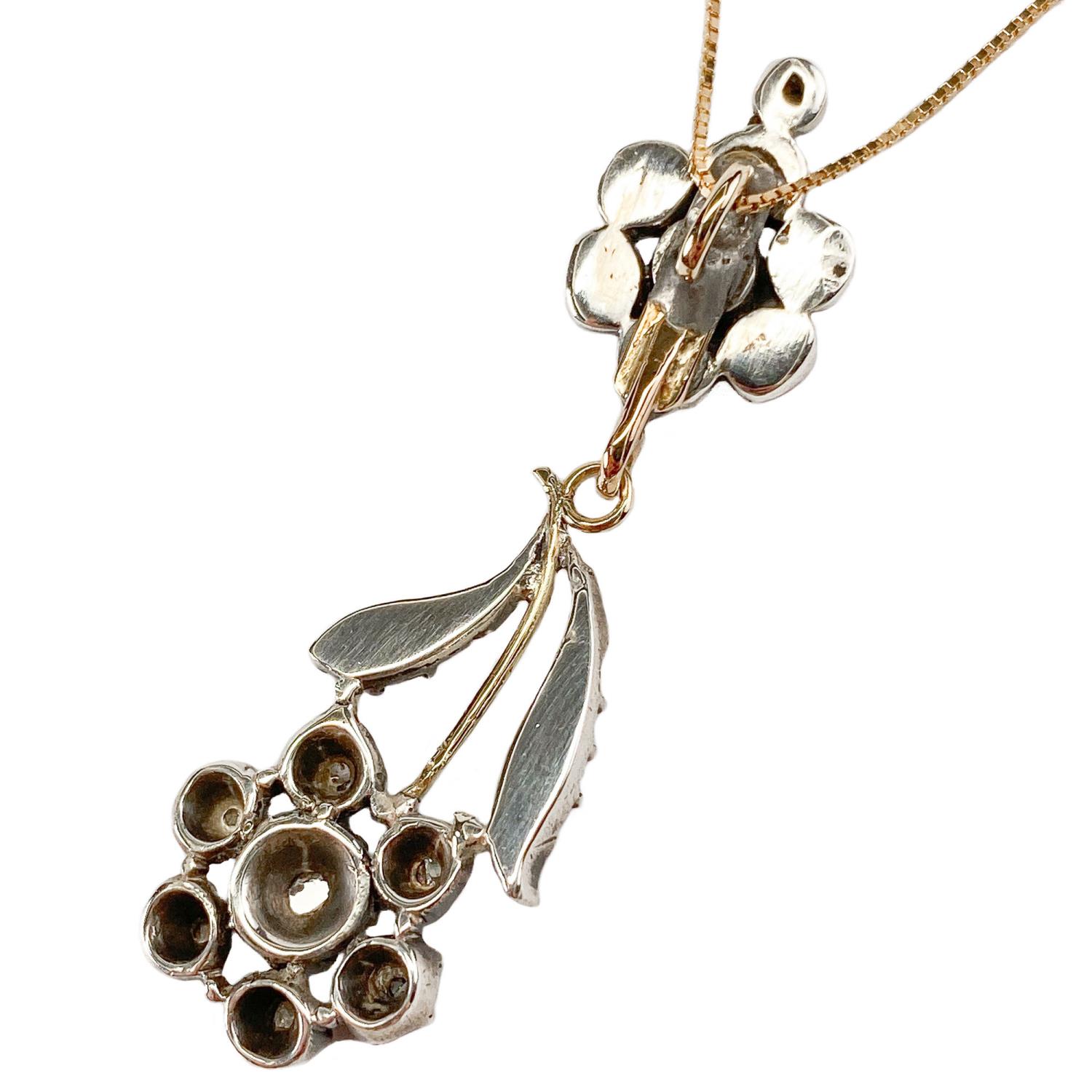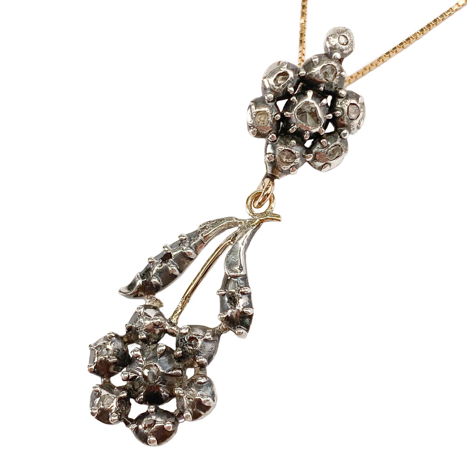 Lovely necklace consisting of a fine box chain made of 18 karat gold and a pendant crafted of silver and gold dating back to the late 19th century. The pendant consists of a daisy and a hanging flower illuminated by rose-cut diamonds. Very refined jewelry, in good state of preservation.