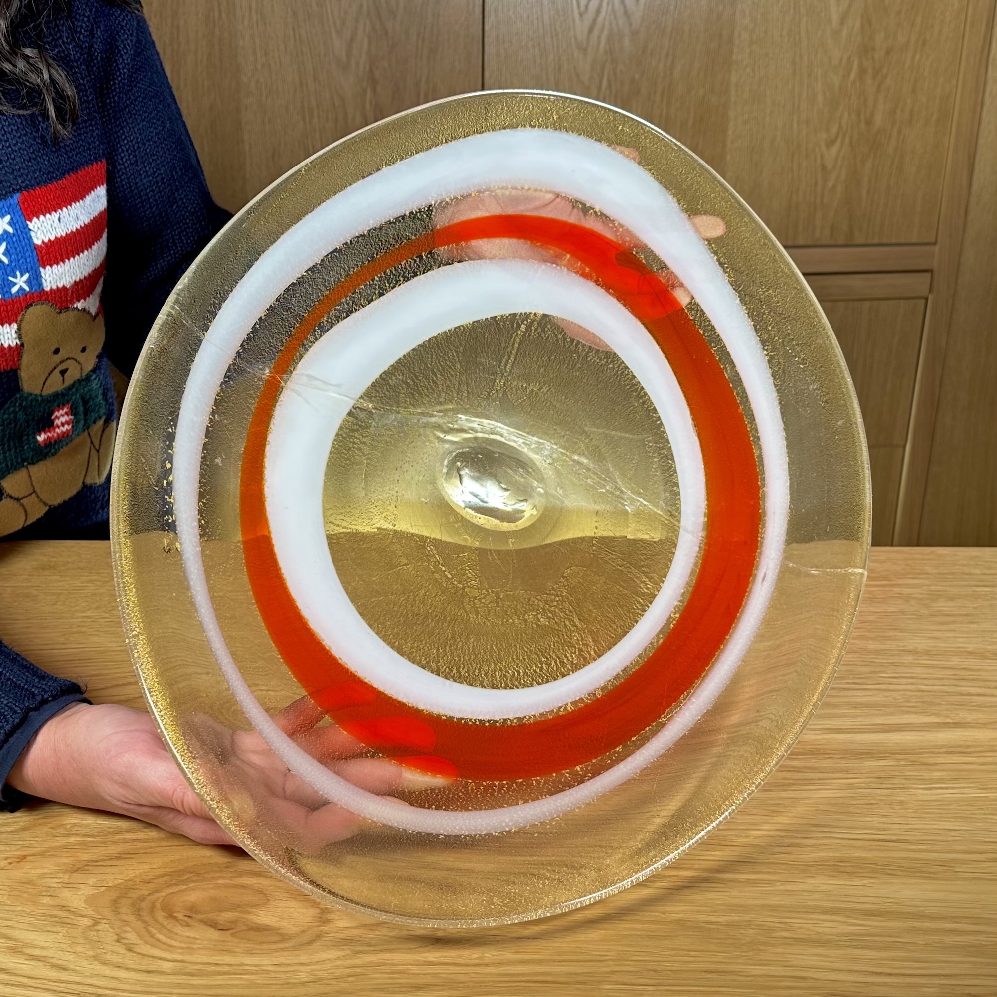 Impressive table centerpiece in Murano glass, consisting of crystal glass with gold foil, decorated with lattimo and orange glass circles. This piece is part of the series Bands, made by Anzolo Fuga for A.Ve.M. (Arte Vetraria Muranese) in 1956, and exhibited in several catalogues regarding Murano glass. This large piece has been restored for a slight crack in the middle.