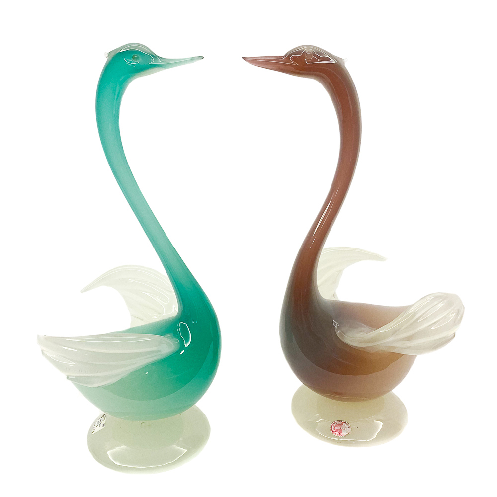 The result is a repertoire of pieces that maintain both figurative clarity and material richness, with details such as applied eyes, thin fins, or a twisted neck defining each work’s identity. Alongside the animals stand human figures and decorative compositions in which filigree, lacework, and feather-like motifs reinterpret sixteenth‑century traditions in a modern key: here the interplay of canes is not mere virtuosity, but a structural design element.