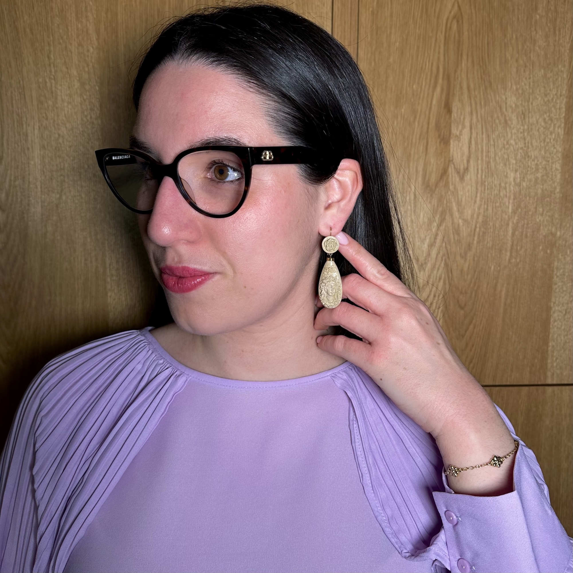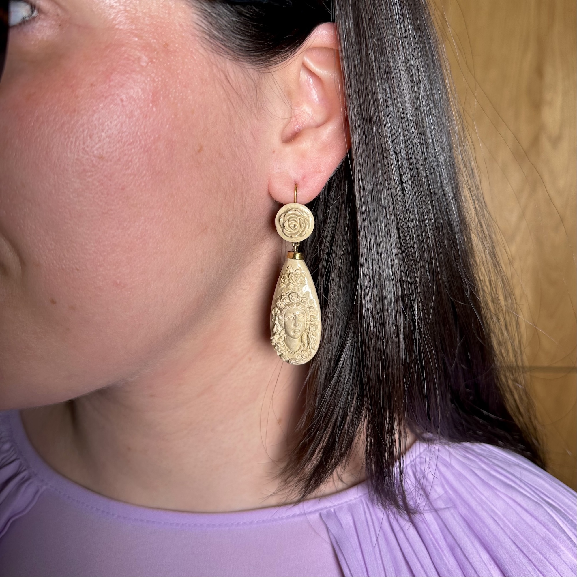 Raffinati orecchini risalenti al periodo liberty, di scuola artigiana partenopea, lavorati in oro rosso 14 karati e pietra lavica. Sul lobo c'è una rosa che trattiene una lunga goccia in pietra lavica, incisa a raffigurare un volto femminile tutto attorniato da fiori. Si tratta di un gioiello particolare per il tipo di materiale con cui è stato realizzato: la pietra lavica, un materiale primordiale molto affascinante.
