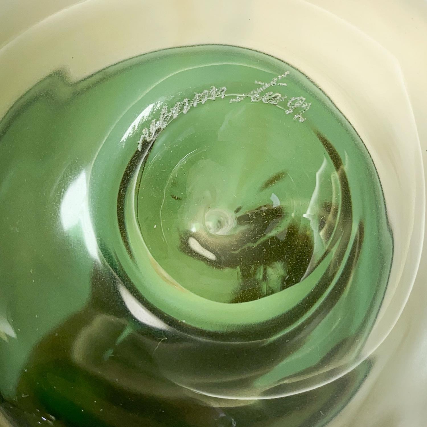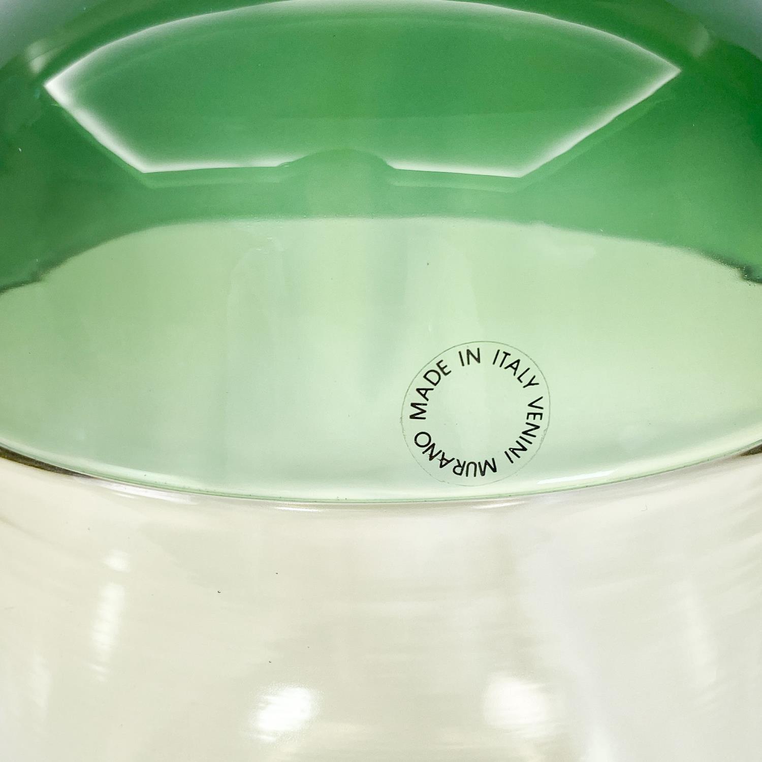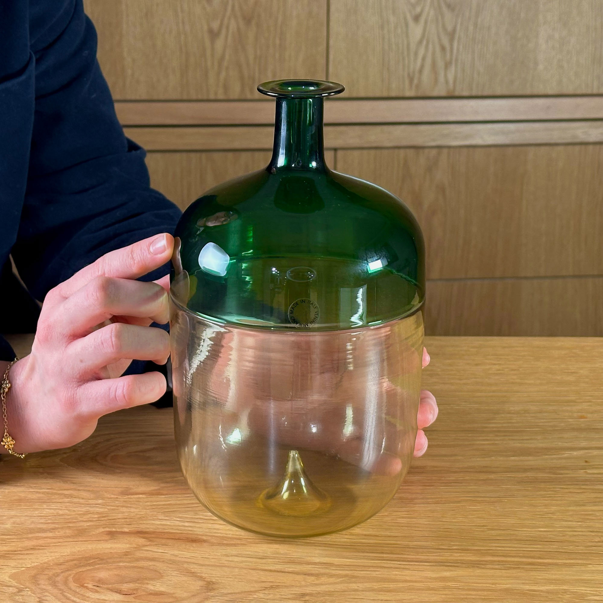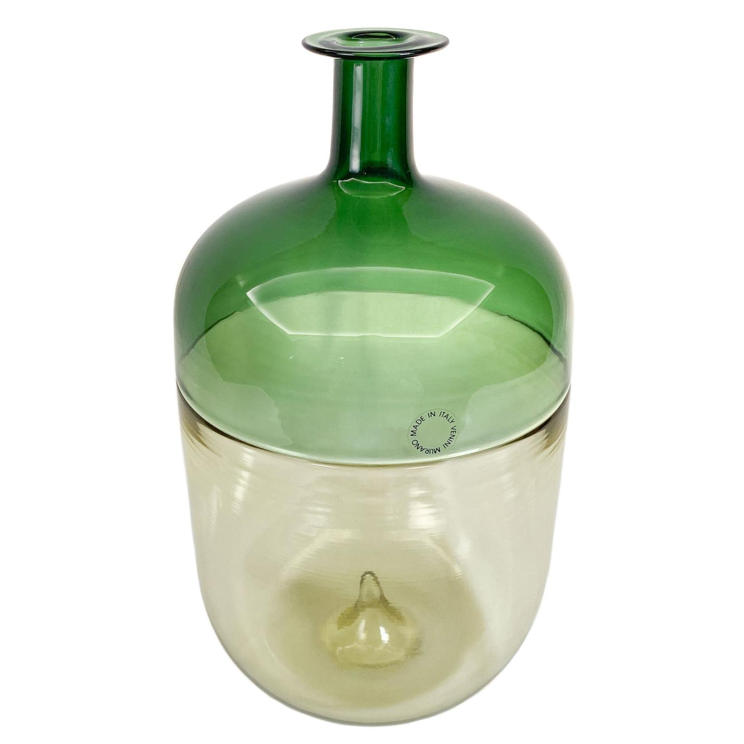 Bottiglia in vetro di Murano appartenente alla serie Bolle, disegnata dal design finlandese Tapio Wirkkala per la fornace Venini nel 1966. E' realizzata in vetro soffiato color pagliesco con incalmo nella parte superiore e nel collo in vetro verde mela. Reca alla base firma incisa "Venini TW 92". Splendido pezzo da collezione, in perfetto stato di conservazione. E' pubblicata su "Venini Catalogo ragionato '21- '86" pag. 229.