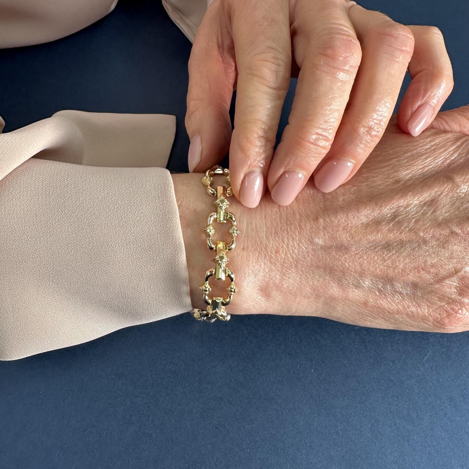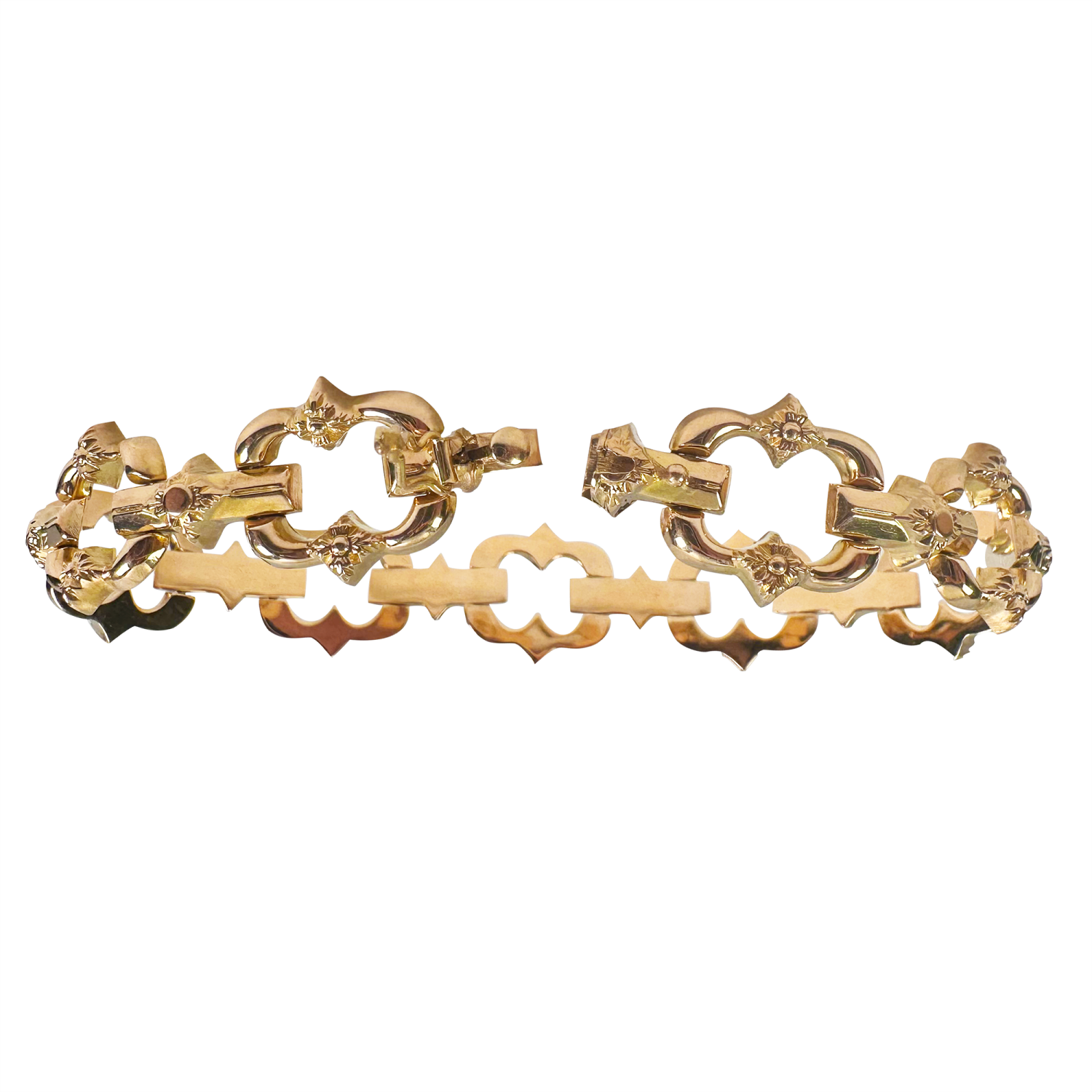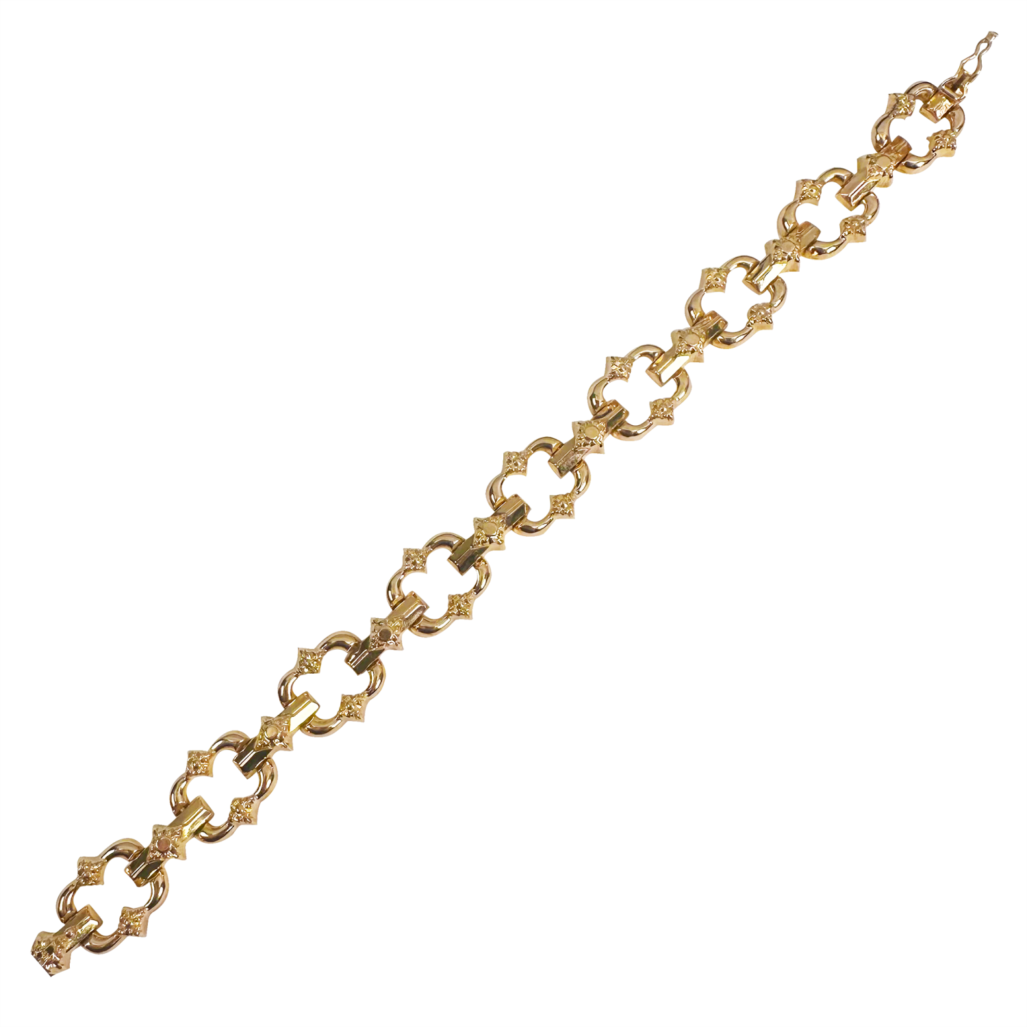 Delizioso bracciale realizzato in oro giallo 18 karati composto da maglie a motivo geometrico floreale, formate da elementi sagomati ad arco impreziositi al centro da piccole decorazioni a fiore in rilievo. Le maglie sono collegate tra loro da giunzioni rigide sfaccettate, che donano movimento pur mantenendo la solidità del disegno. La superficie è lucida, mentre i rilievi decorativi regalano un contrasto tattile e luminoso. Esempio di elegante lavorazione del dopoguerra, che coniuga rigore geometrico e morbidezza plastica tipica del gusto della fine degli anni Quaranta. Il gioiello si presenta in ottimo stato di conservazione.