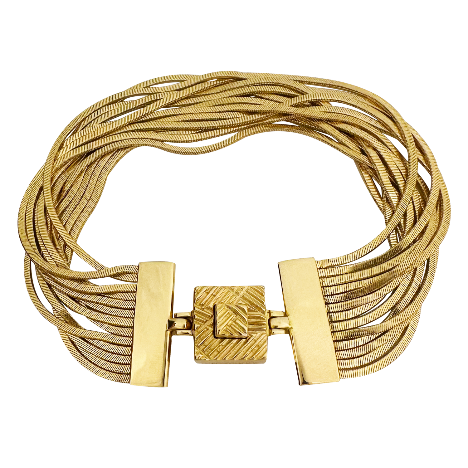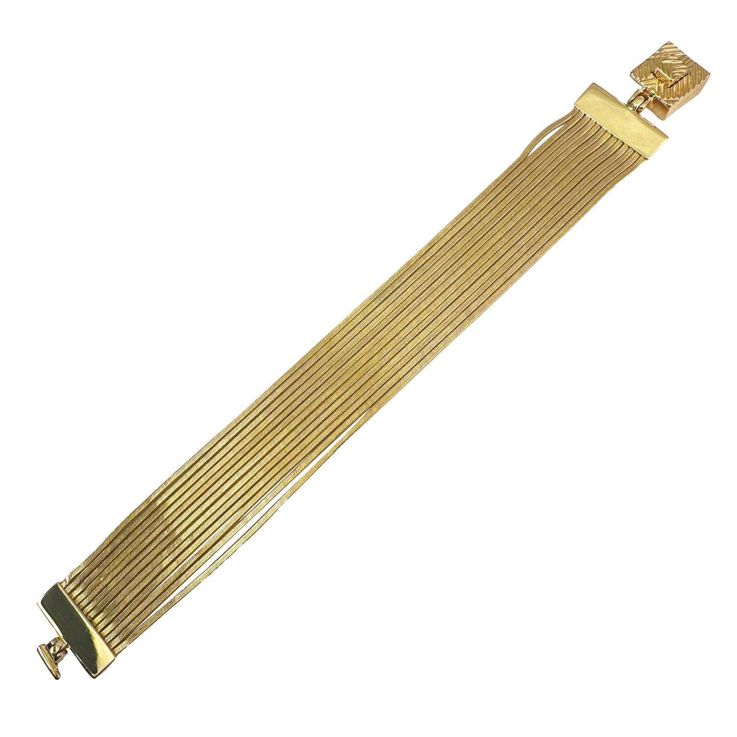 Raffinato bracciale realizzato in oro giallo 18 karati firmato Unoaerre, caratterizzato da un design elegante e strutturato. La composizione è formata da tredici fili con la superficie incisa trattenuti da due barre laterali con finitura lucida che esalta la luminosità del metallo. Il punto focale è la particolare chiusura centrale formata da un elemento quadrato con incisioni a motivo diagonale che diventa motivo decorativo. Gioiello di alta manifattura, espressione dello stile iconico di Unoaerre, ancora in perfetto stato di conservazione.