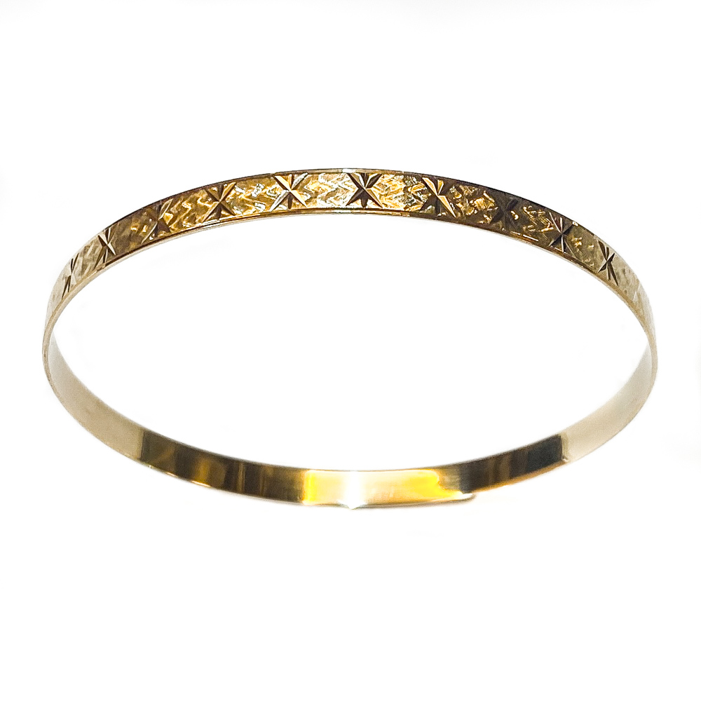 Bracciale rigido a tagliatella di 6,5 cm di diametro, in oro giallo 18 karati con la superficie completamente incisa a motivo di stelle. Il gioiello, realizzato da una manifattura di Vicenza, è lavorato in modo accurato e si presenta in ottimo stato.