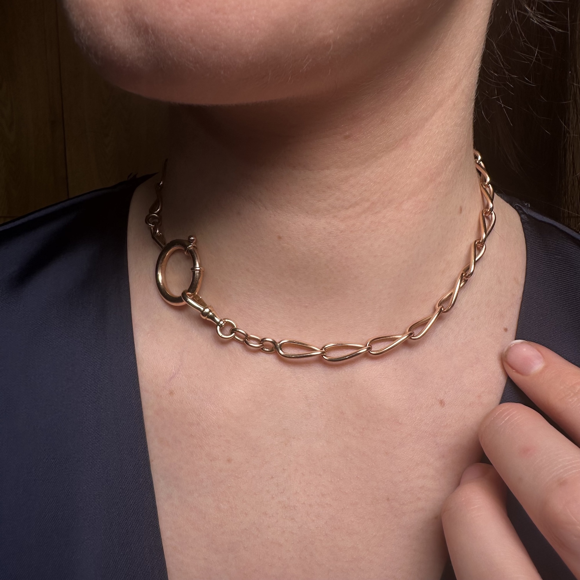 Antica catena da orologio da tasca realizzata in oro rosso 18 karati formata da maglie ovali concatenate. Sui due terminali sono presenti un moschettone classico per agganciare l'orologio e un moschettone ad anello a molla. Lo stato di conservazione è ottimo.
