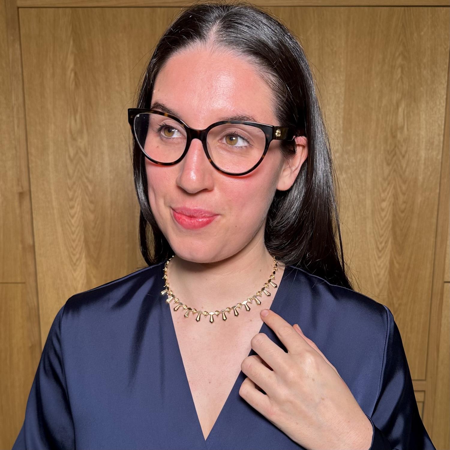 Bella collana girocollo realizzata in oro rosa 18 karati, risalente agli anni '40 del Novecento, caratterizzata da un design geometrico di grande originalità. La struttura è composta da elementi a rombo sfaccettati che si alternano a piccoli motivi dalla forma a fiore trattenuti da un semicerchio. Nella parte centrale, pendono eleganti terminali a forma di prisma, che creano un movimento armonioso e un effetto luminoso molto particolare. Gioiello raffinato, dal gusto ricercato e in perfetto stato di conservazione.
