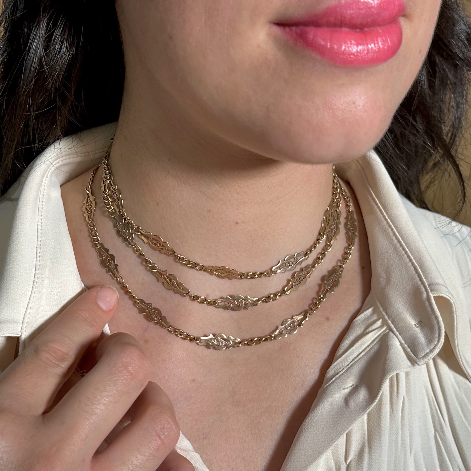 Lunga collana realizzata in oro rosso 9 karati composta da deliziose losanghe alternate ad alcune maglie di catena. La lavorazione sinuosa delle losanghe rispecchia lo stile Liberty del periodo in cui questa collana è stata realizzata. Gioiello che mantiene inalterato il fascino del tempo, in ottimo stato di conservazione.