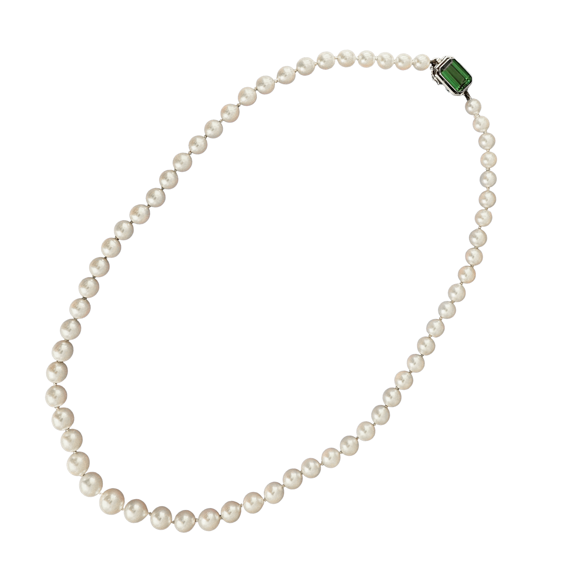 Deliziosa collana girocollo realizzata con 61 perle Akoya disposte a scalare dal centro con un diametro compreso fra i 6,00 e i 9,00 mm. Le perle sono sferiche, di un bel colore bianco con sfumatura crema con piccolissime imperfezioni che ne attestano la natura organica. Nella chiusura in oro bianco 18 karati è inserita una tormalina verde rettangolare che regala un piacevole tocco cromatico. Gioiello di buon gusto, in ottimo stato di conservazione.