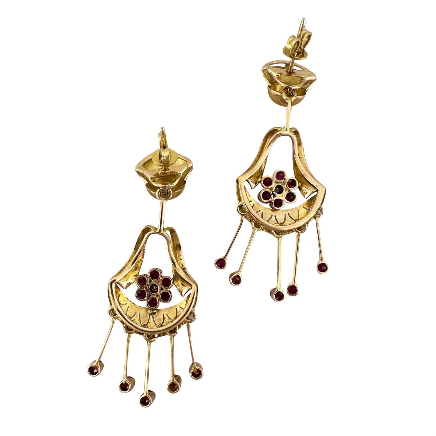 Originale coppia di orecchini pendenti realizzati in oro giallo 18 karati, caratterizzati da un design ricco di movimento e dettagli decorativi. Al centro di ciascun orecchino spicca una margherita di rubini di taglio huit-huit con un piccolo diamante, inserita all'interno di una struttura bombata, finemente incisa e modellata con linee fluenti, che crea un bell' effetto tridimensionale. Dal corpo principale si diramano cinque frange mobili, ciascuna terminante con un rubino montato a giorno, che aggiunge luce, colore e una piacevole oscillazione a ogni gesto. Gioielli di buon gusto, ricchi di personalità e in perfetto stato di conservazione.