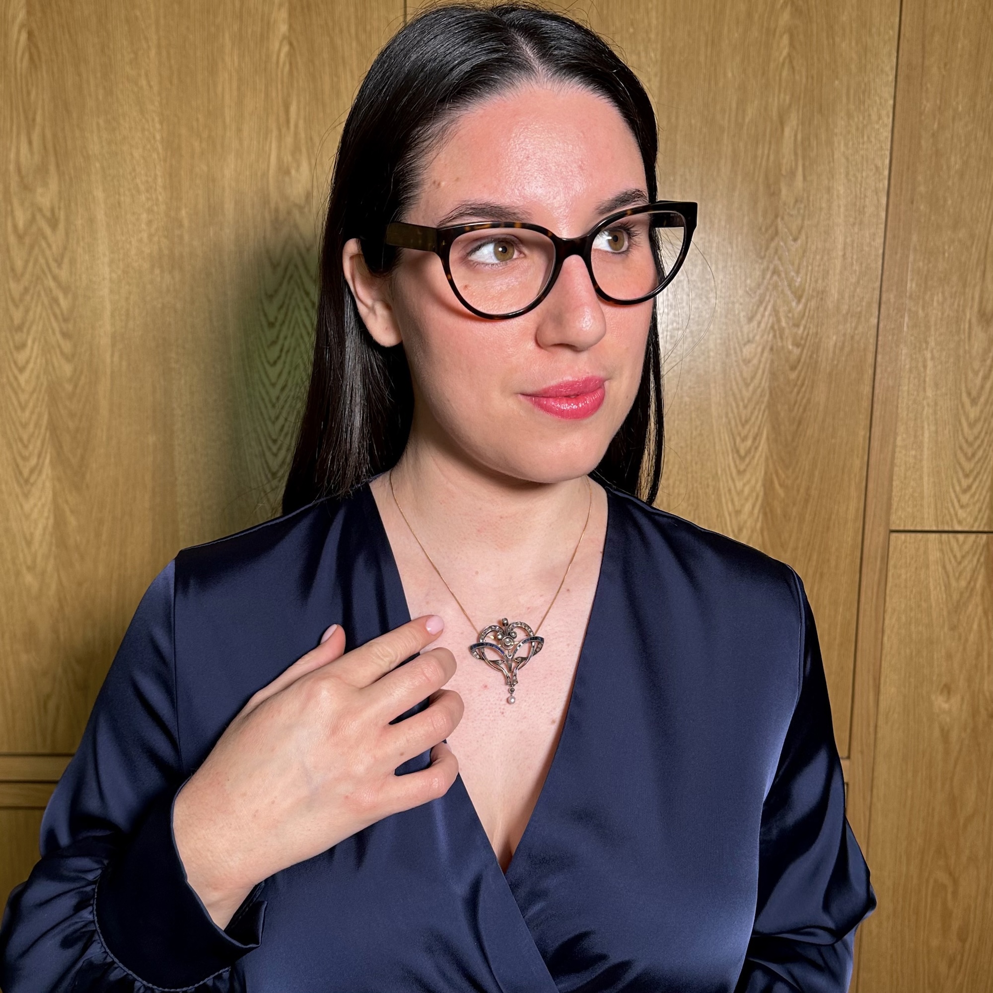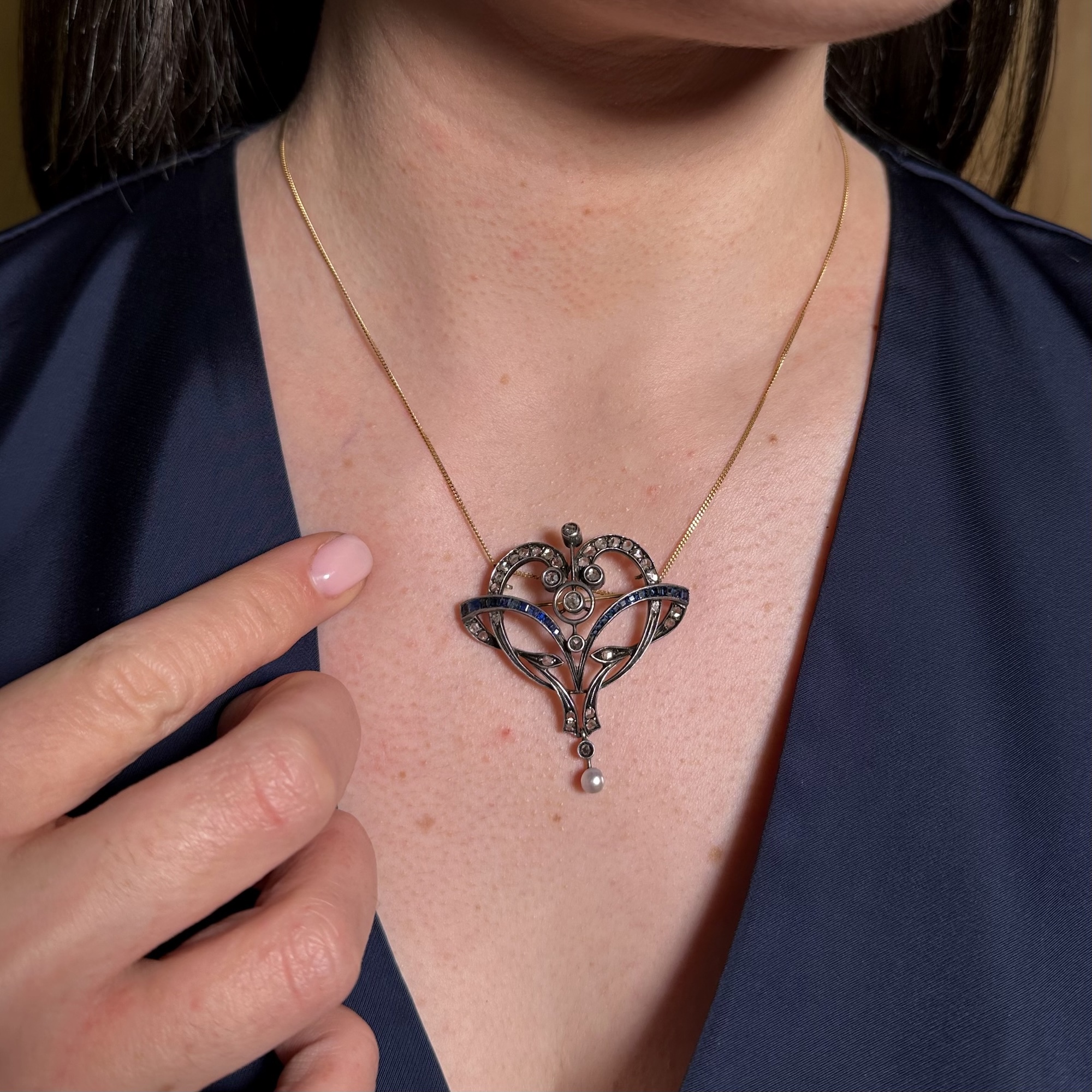 Bellissima spilla-pendente realizzata in oro e argento, impreziosita da diamanti taglio a rosetta e zaffiri carré con una piccola perla naturale che pende in basso. Databile nei primi anni del Novecento per le evidenti influenze delle sinuosità tipiche del Liberty a cui si giustappone la simmetria e la regolarità della lavorazione. Gioiello molto fine ed elegante, in perfetto stato di conservazione.