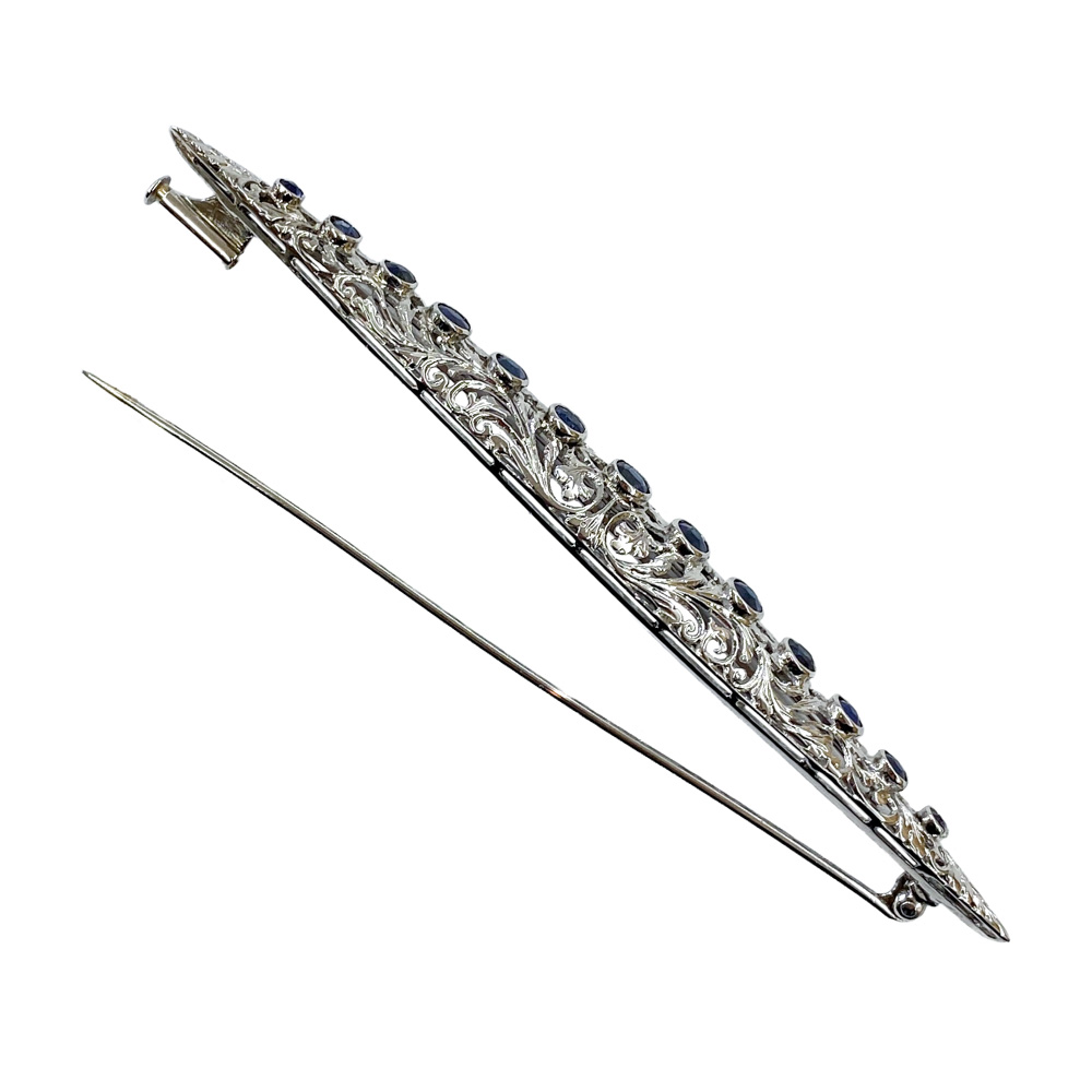 Bellissima spilla risalente ai primi anni del Novecento, realizzata artigianalmente in oro bianco 18 karati. La classica forma a barretta è abbellita da una sapiente lavorazione a traforo a tralci e foglie che caratterizza tutta la superficie del gioiello. Una fila di zaffiri naturali rotondi, di un colore molto intenso, regala un particolare fascino a questo raffinato gioiello. Lo stato di conservazione è ottimo.