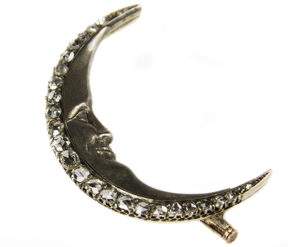 Autentico gioiello a spilla della metà dell'Ottocento lavorato in oro ed argento. Si tratta di una splendida rappresentazione di uno spicchio di luna con il profilo di un volto che guarda verso l'interno,sapientemente lavorato a mano, mentre il semicerchio esterno è interamente impreziosito da un degradè di diamanti con taglio a rosa di Francia. La lavorazione e la patina del tempo rendono questa spilla particolarmente raffinata e originale.